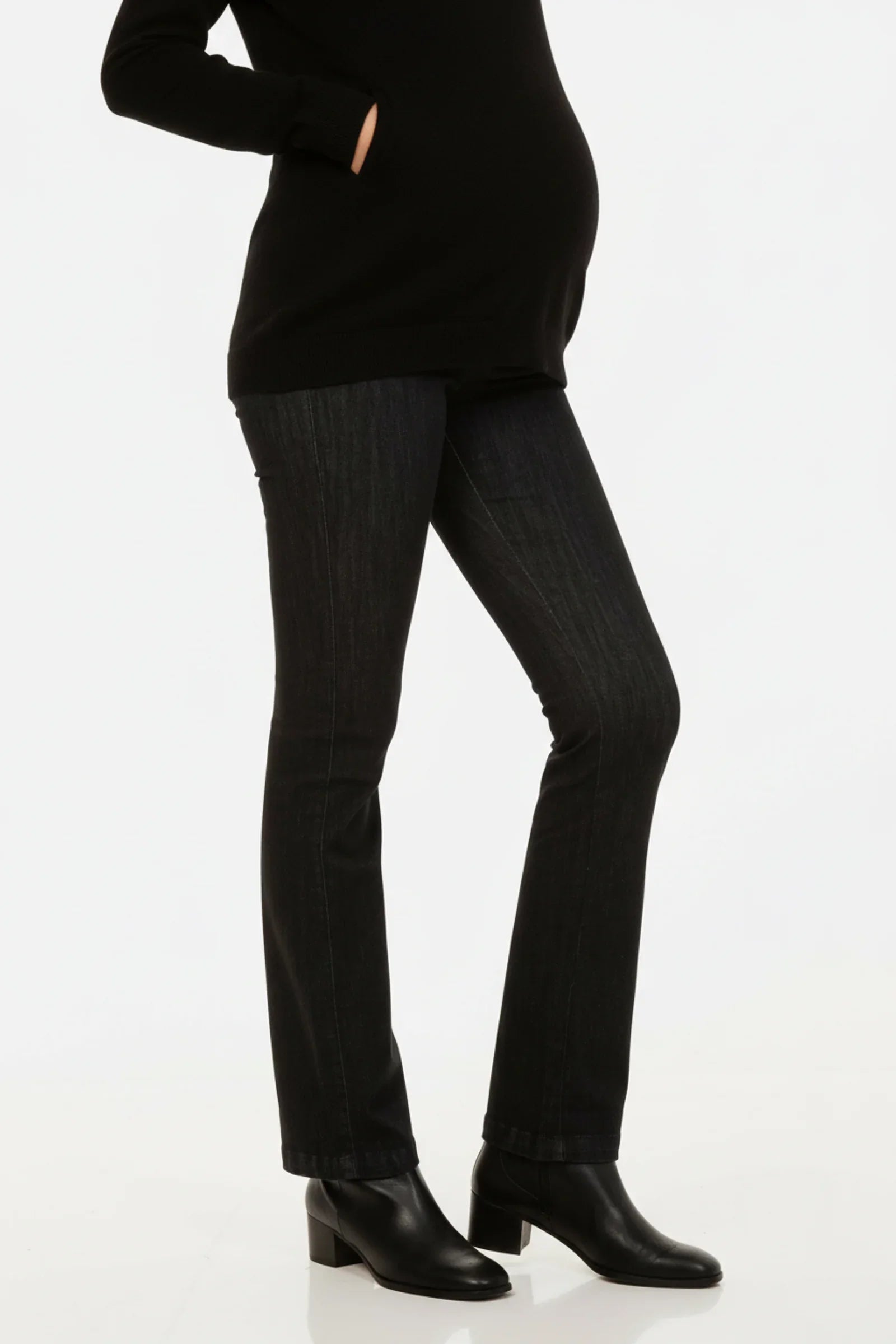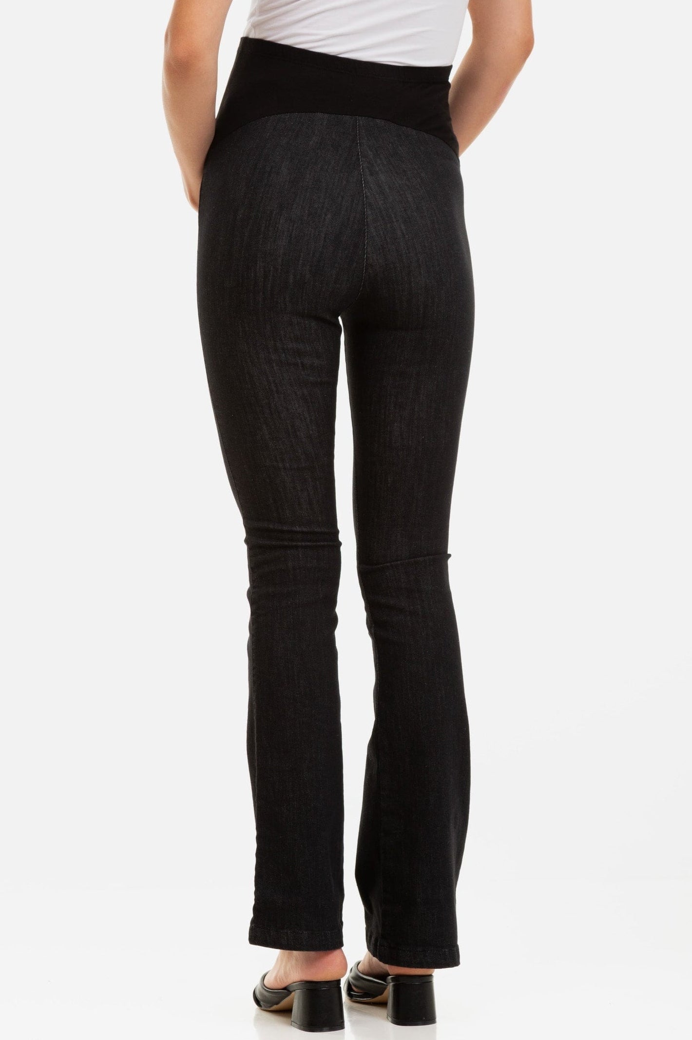 - Jeansy ciążowe wykonane z elastycznego materiału w czarnym kolorze