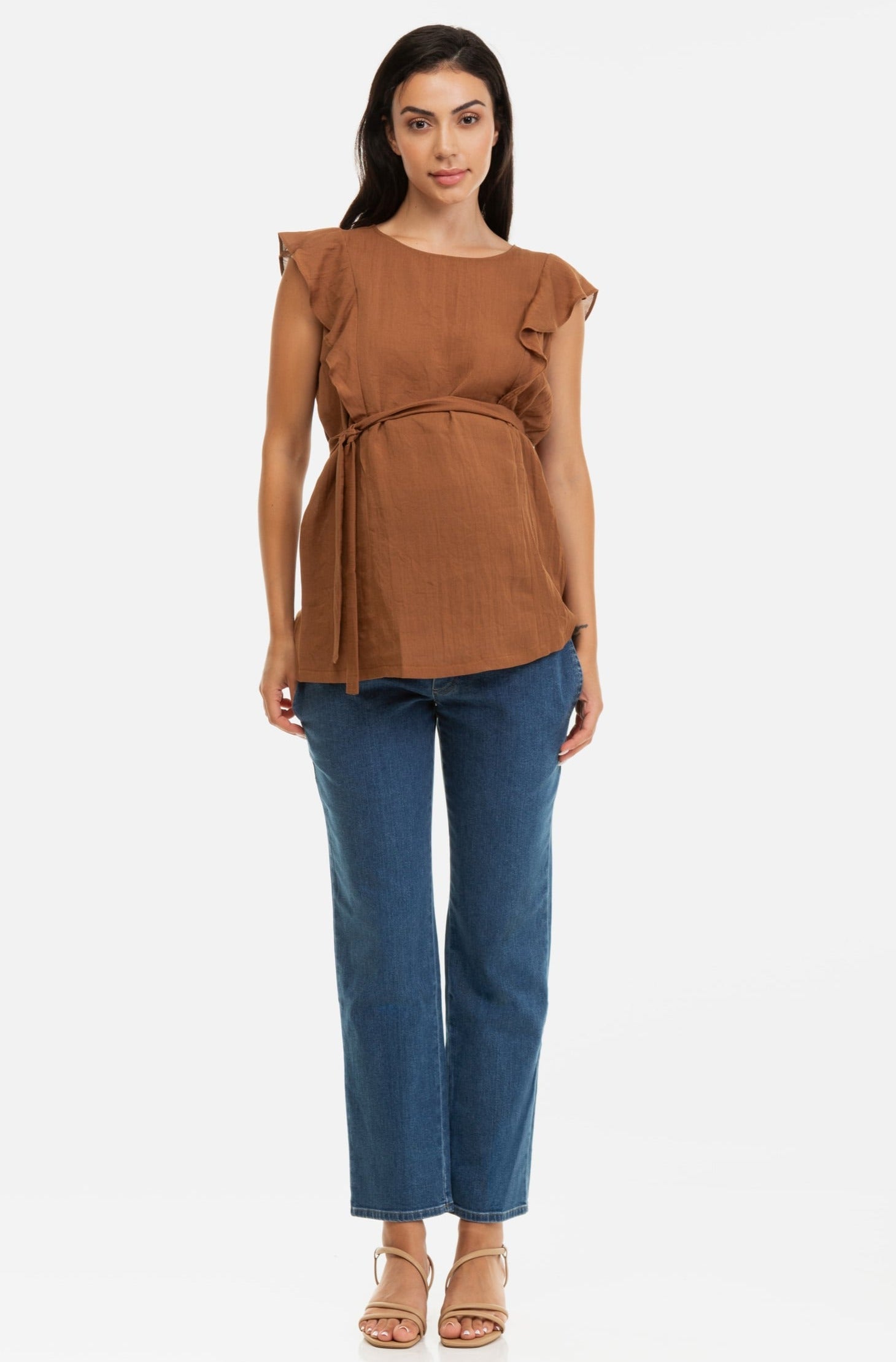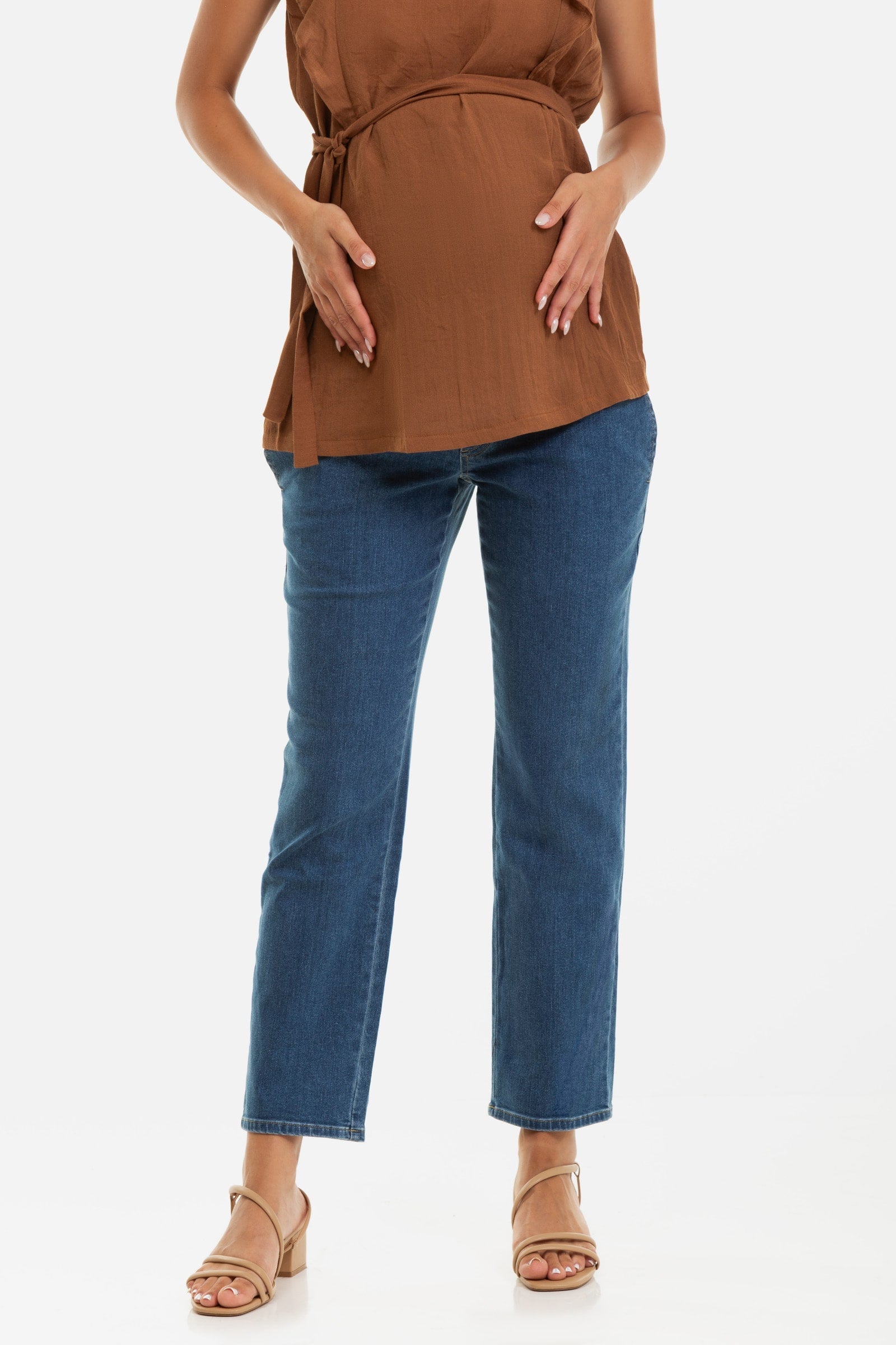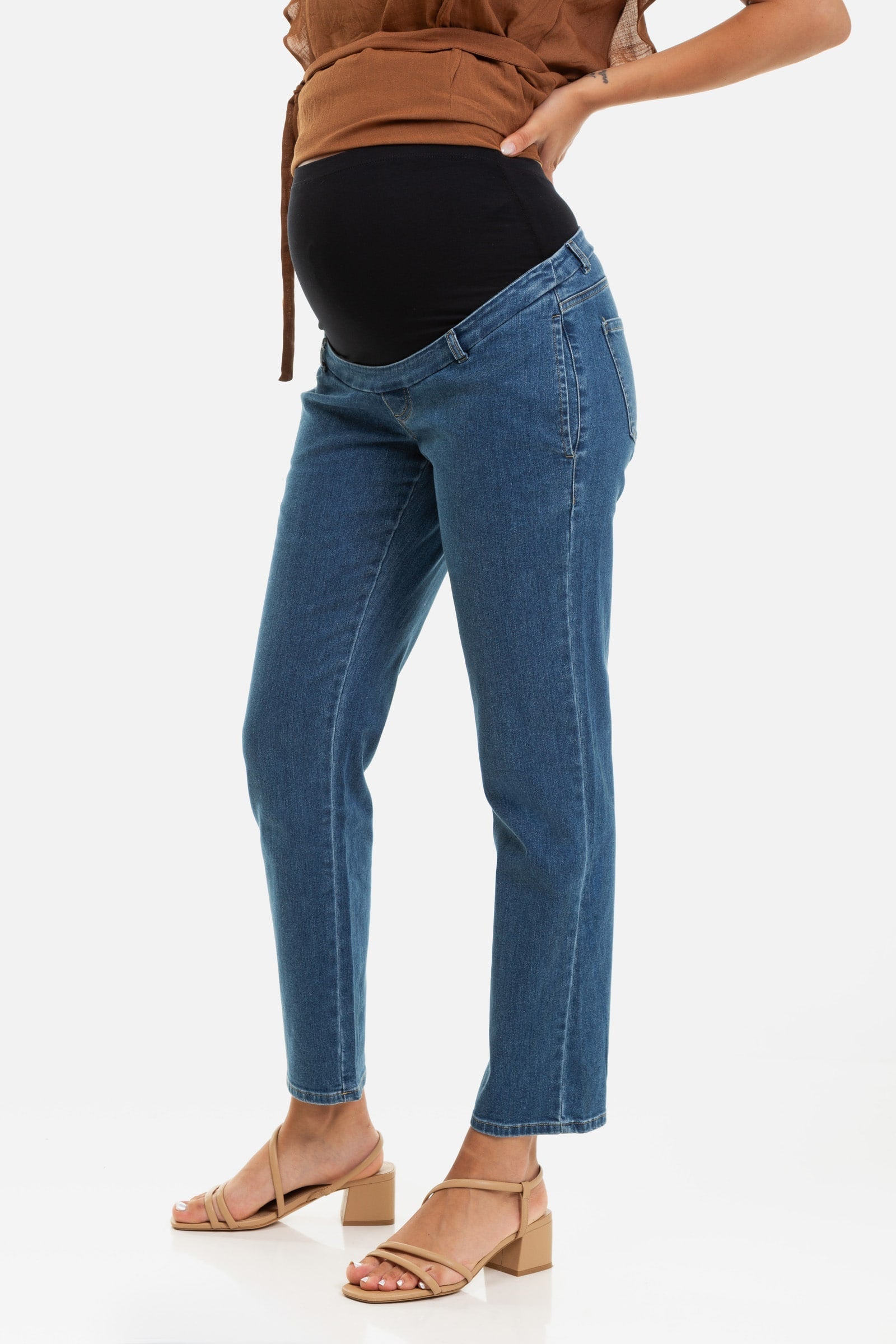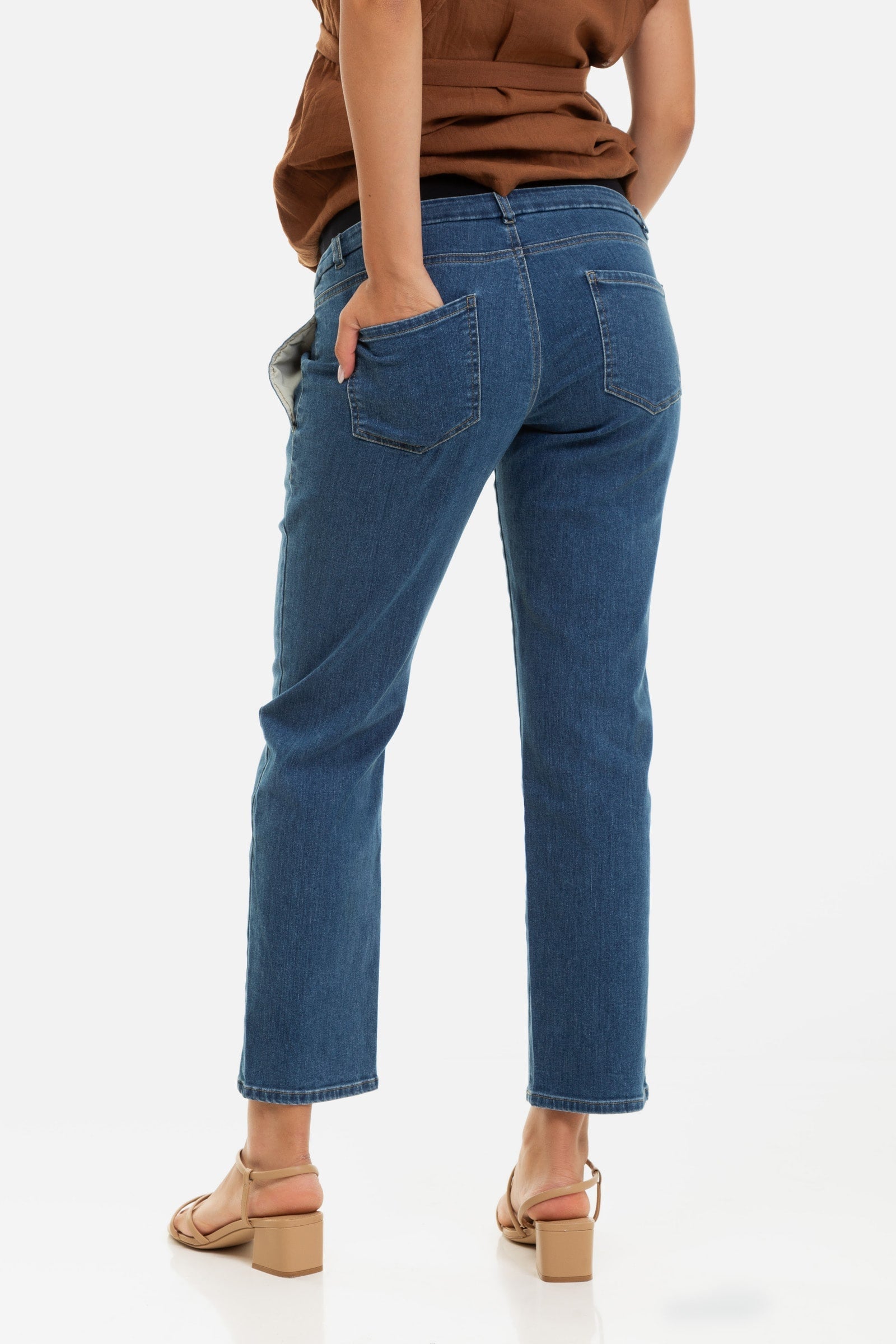 Dzięki specjalnie zaprojektowanemu krojowi górna część dżinsów dopasowuje się równie dobrze na każdym etapie ciąży.
