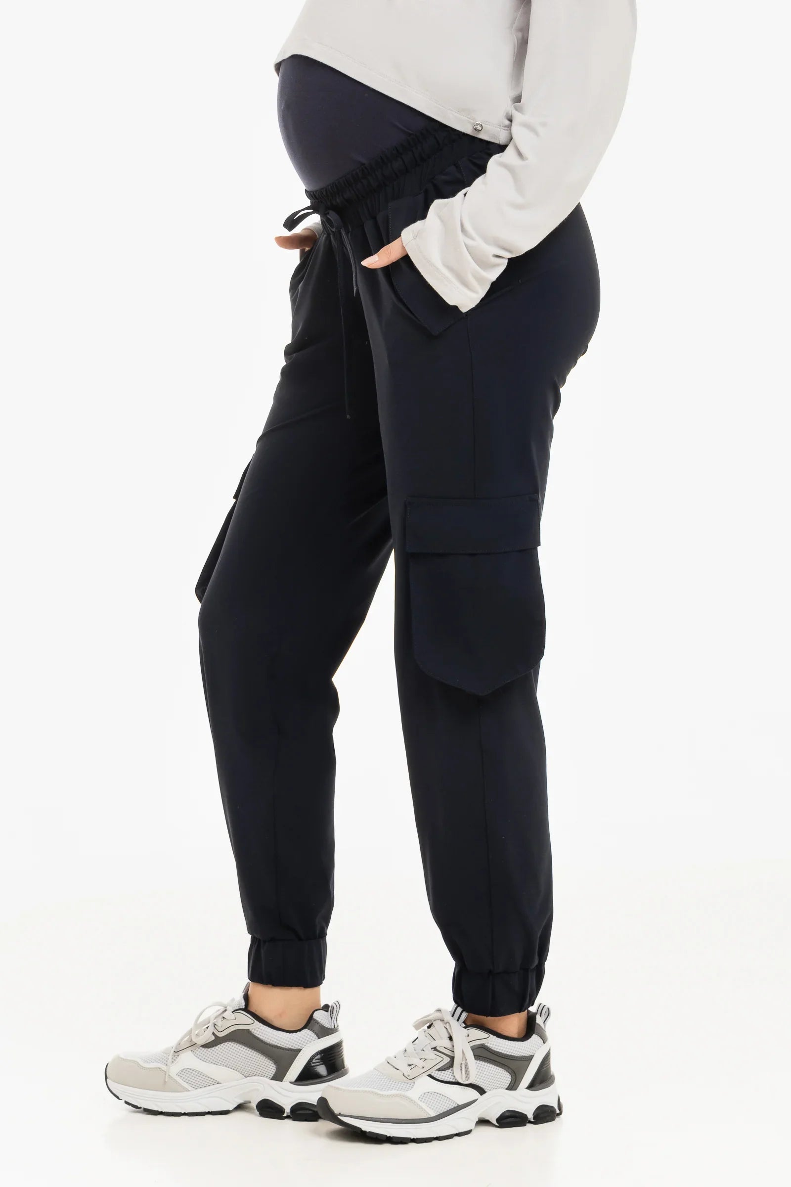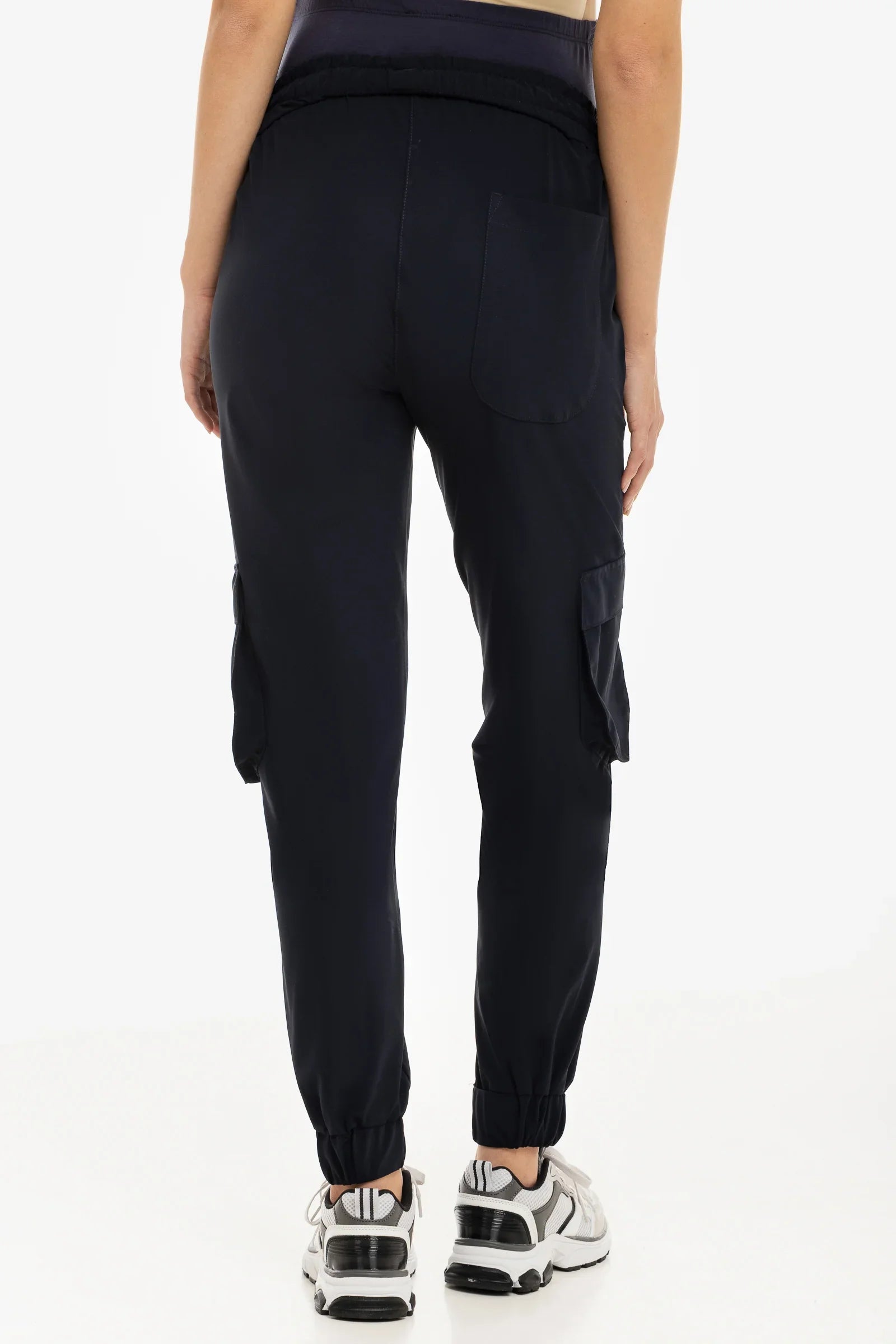 - Sportowo-eleganckie spodnie cargo z elastycznego materiału w ciemnoniebieskim