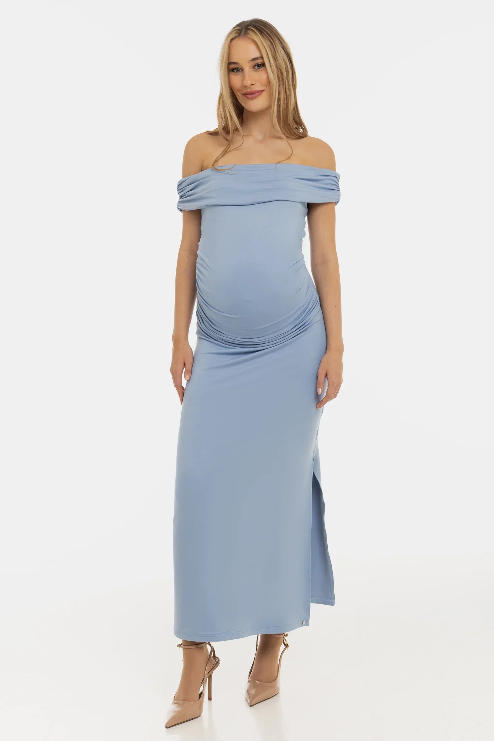Elegancka sukienka ciążowa z marszczeniami – jasnoniebieska
