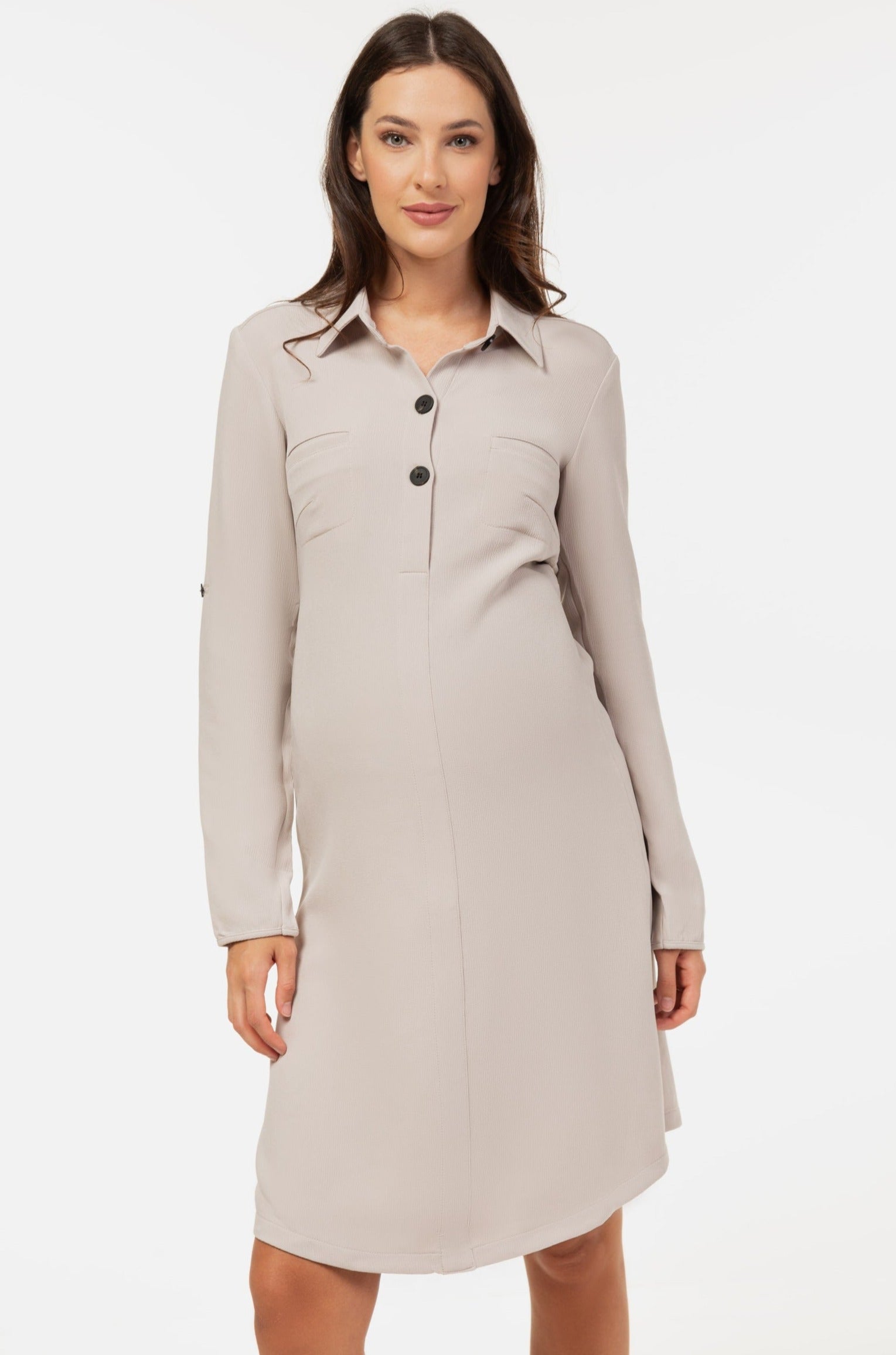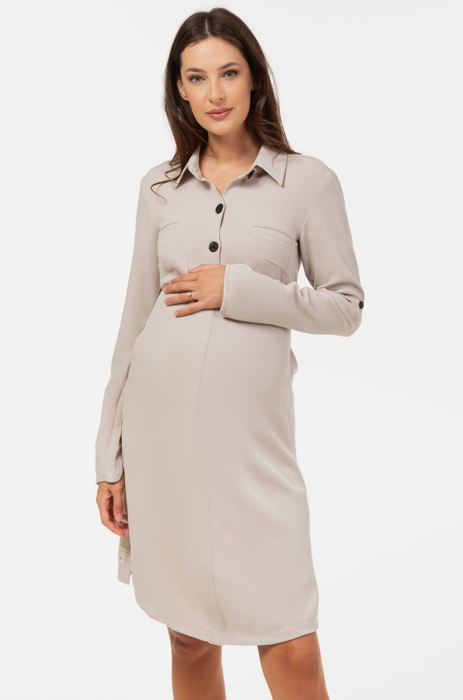 Sukienka koszulowa ciążowa i do karmienia z fakturowanego materiału – jasnobeżowaszara