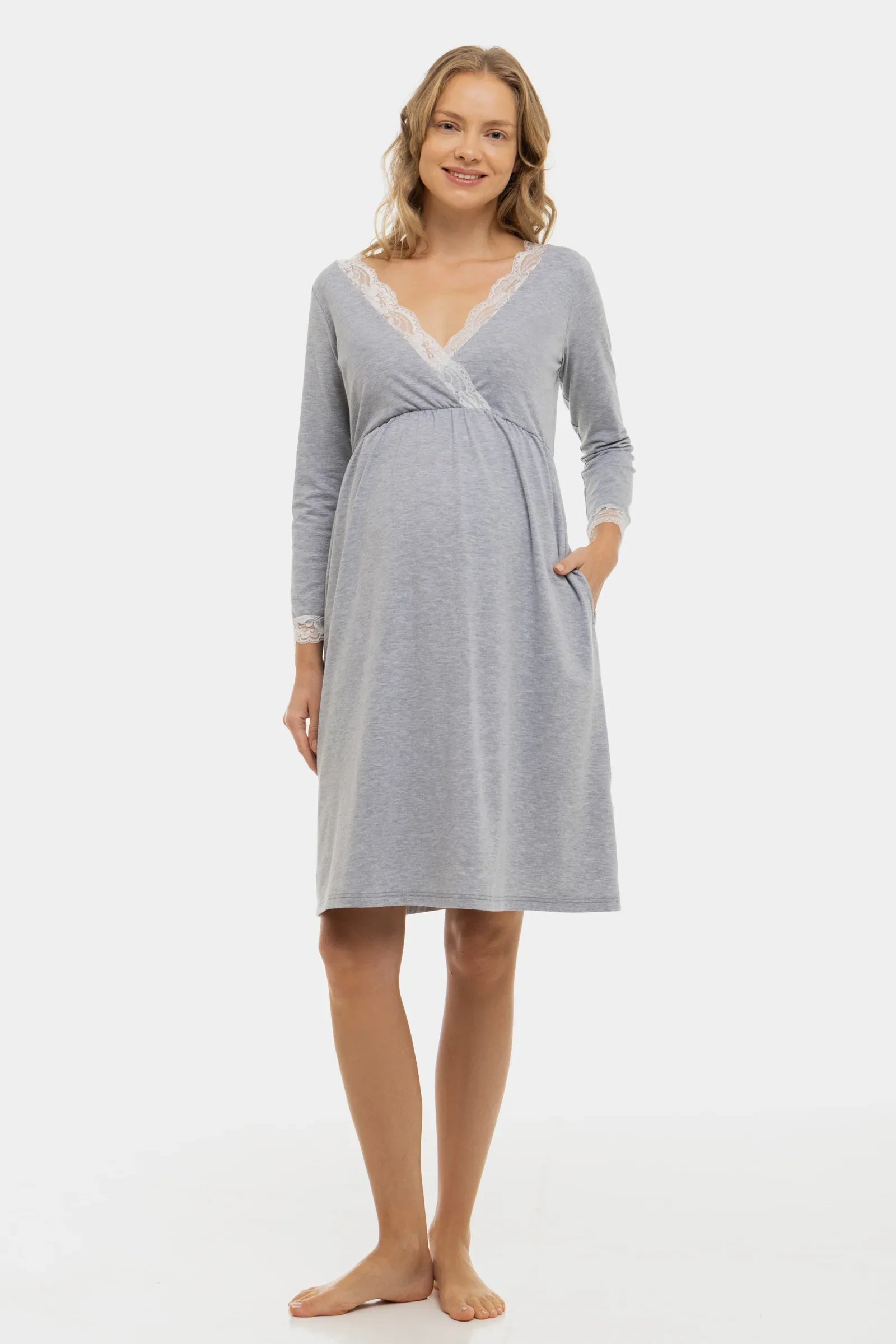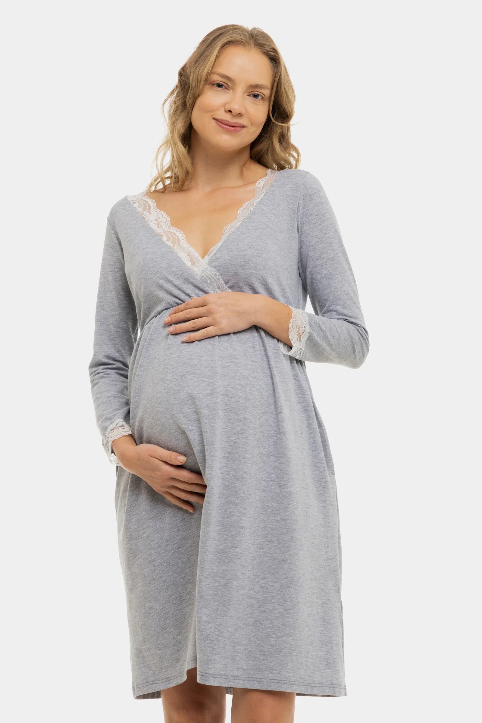 Bawełniana koszula nocna ciążowa i do karmienia z rękawami ⅞ - szara