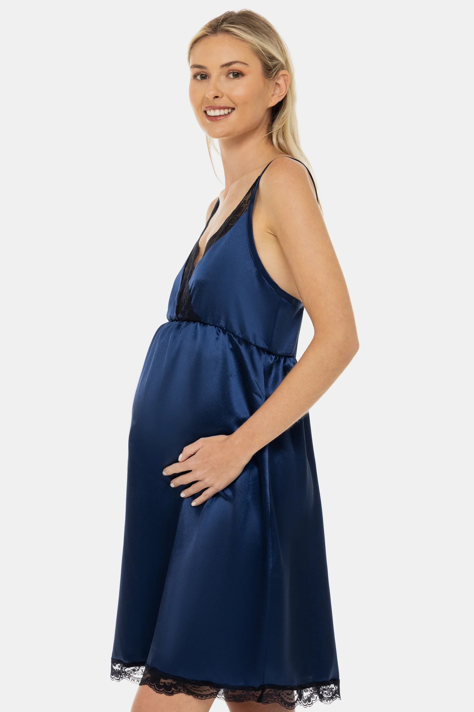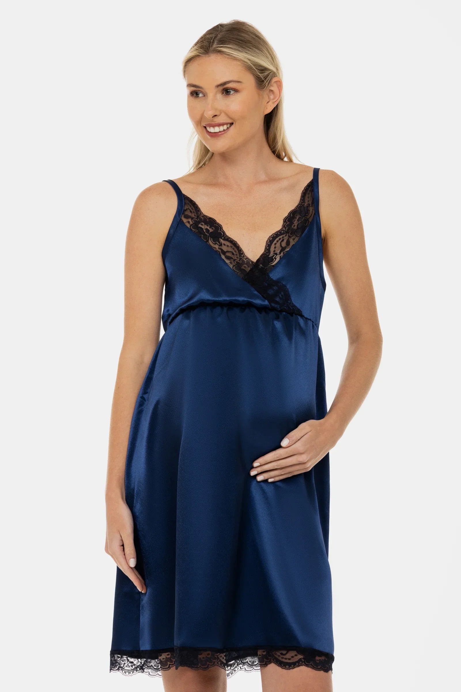 - Koszula nocna ciążowa wykonana z miękkiego satynowego materiału w kolorze granatowym