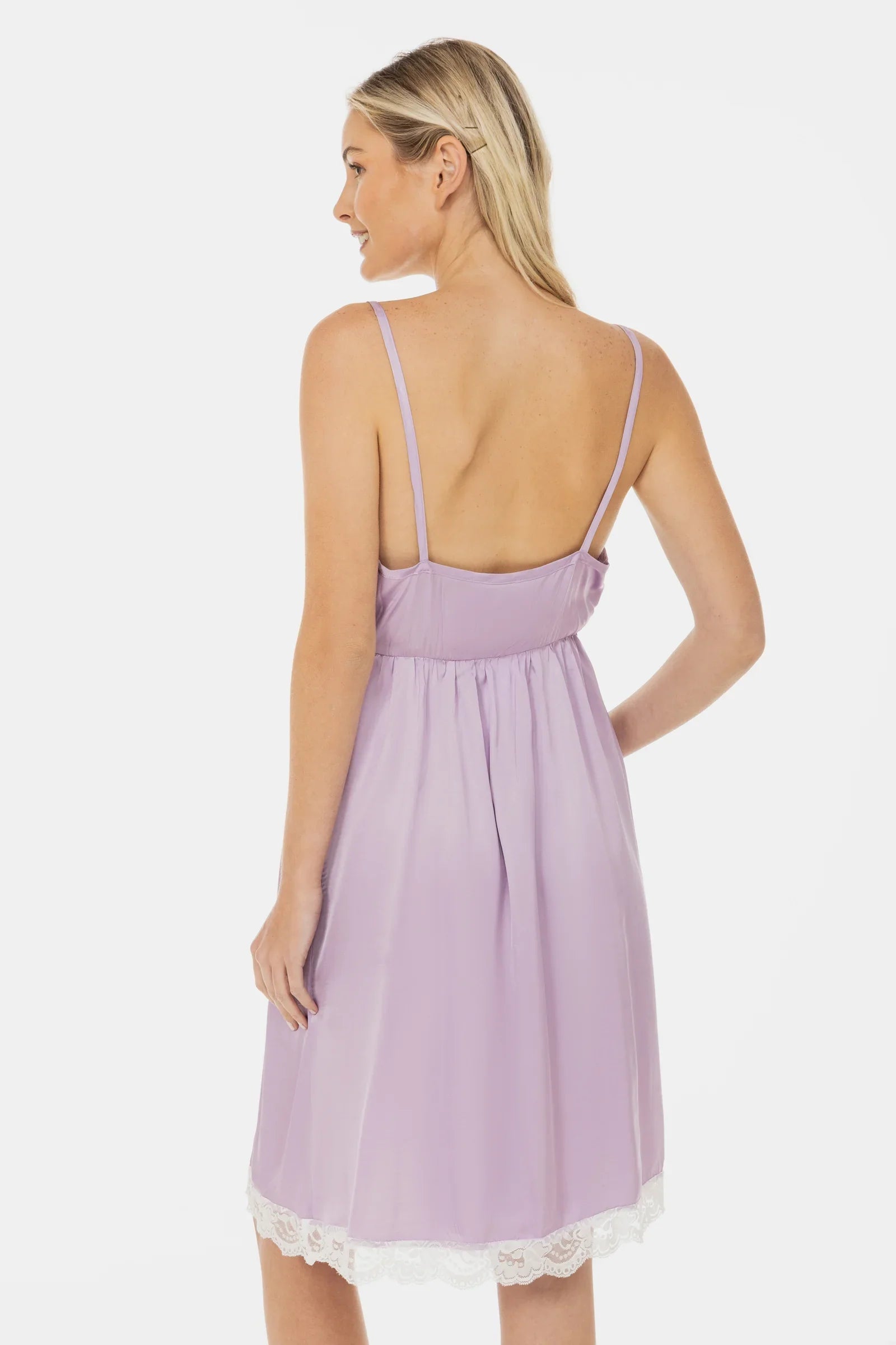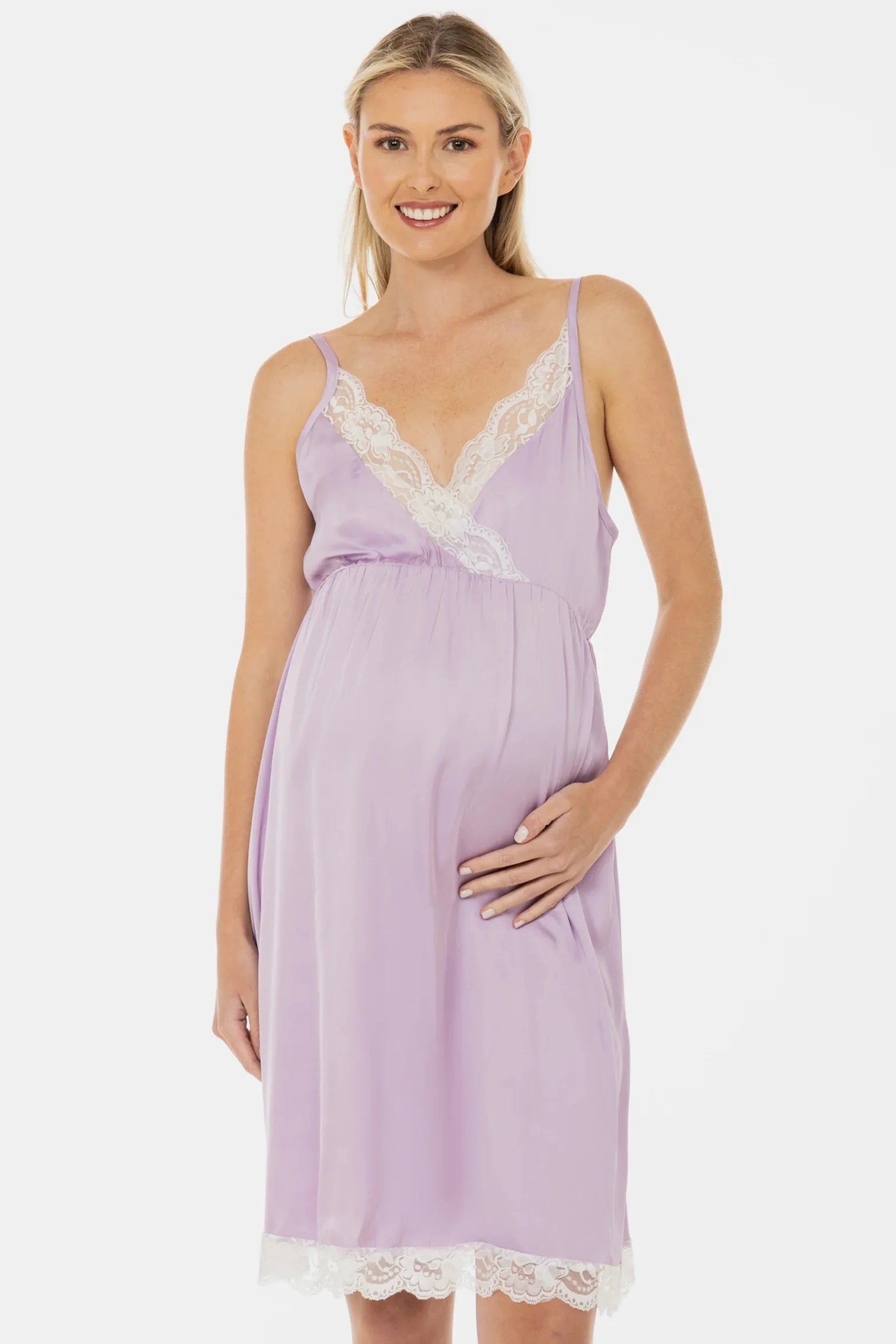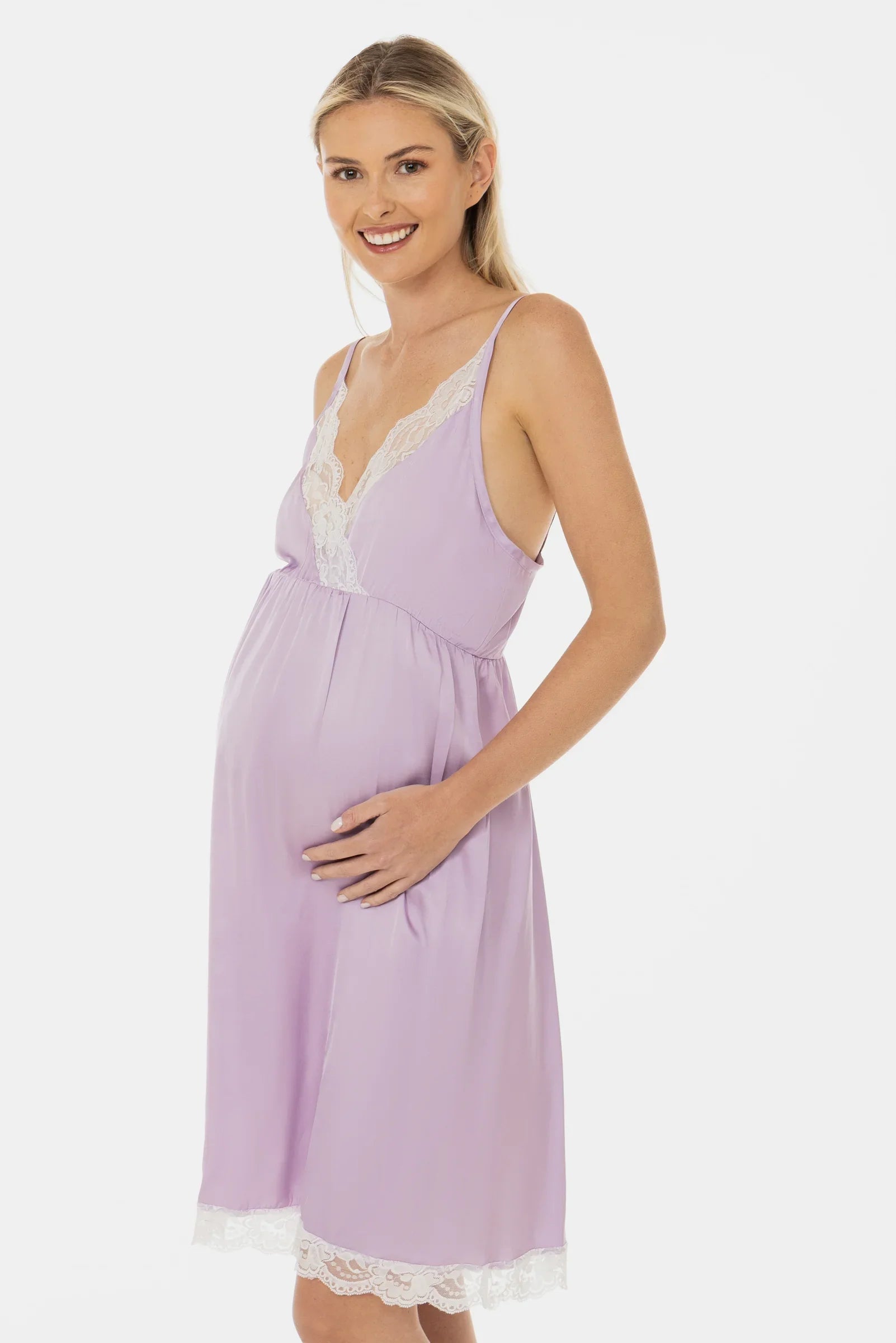 - Koszula nocna ciążowa wykonana z miękkiego satynowego materiału w kolorze bladoliliowym