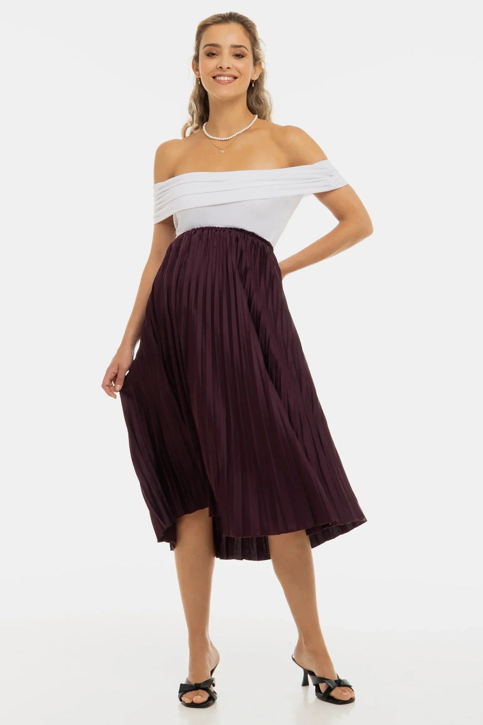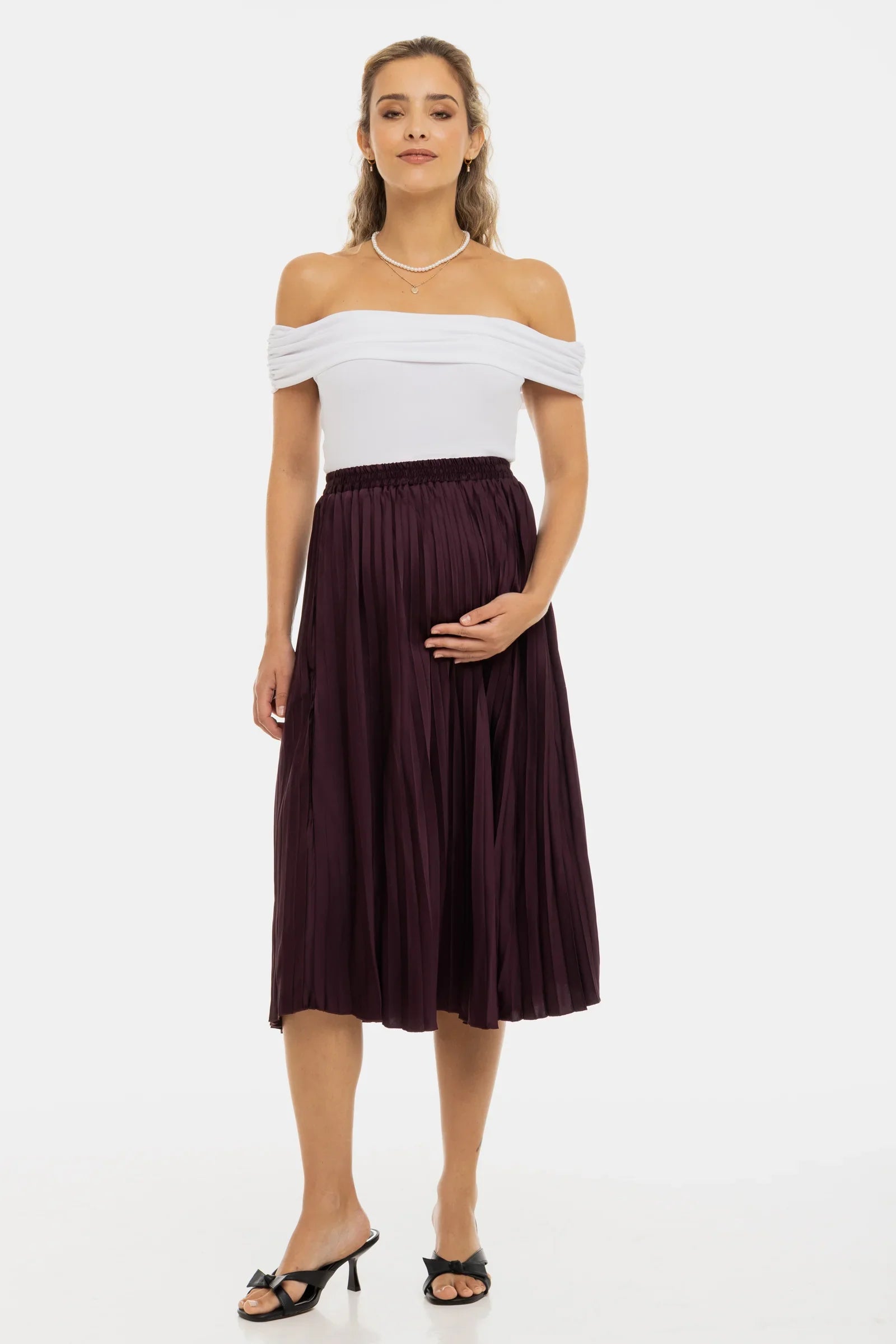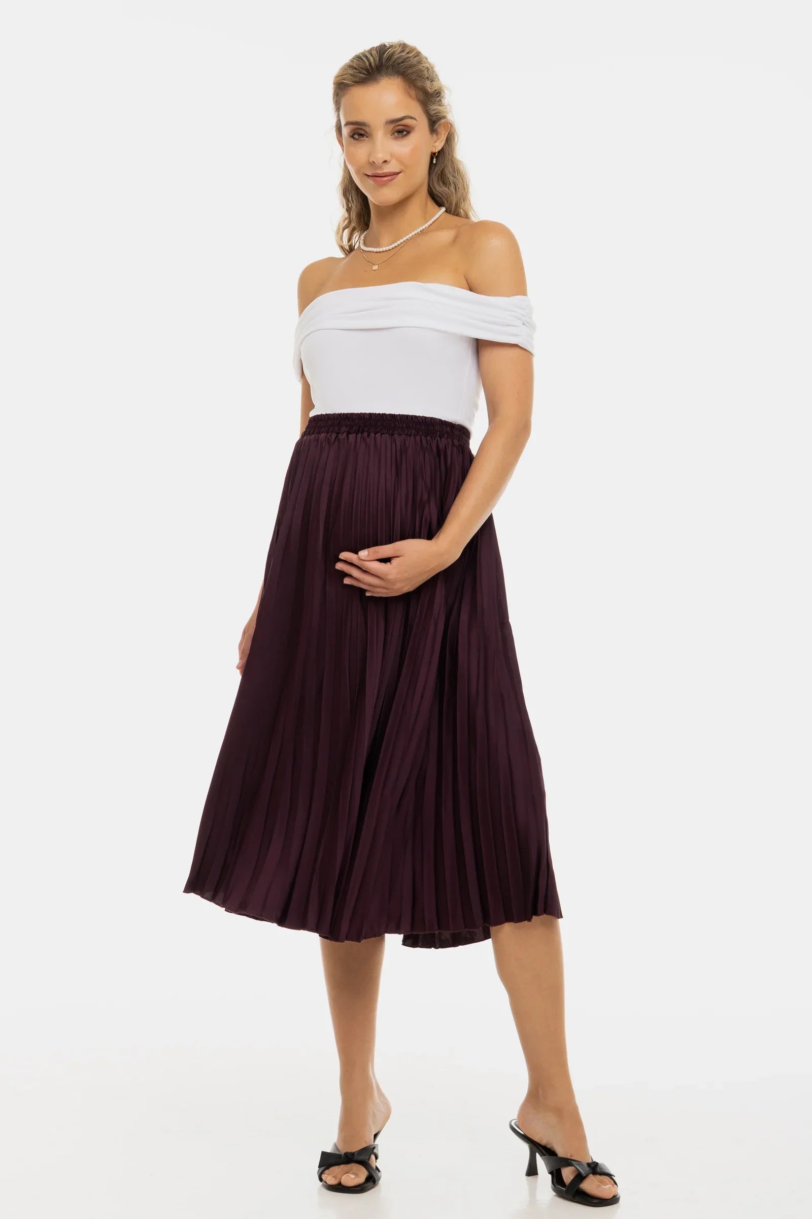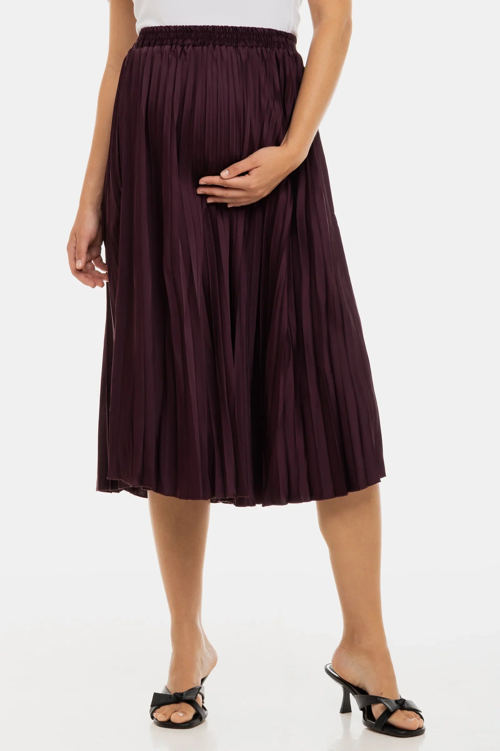 Lekka i zwiewna spódnica ciążowa w delikatnym odcieniu, która zamienia każdą chwilę w powód do lśnienia.