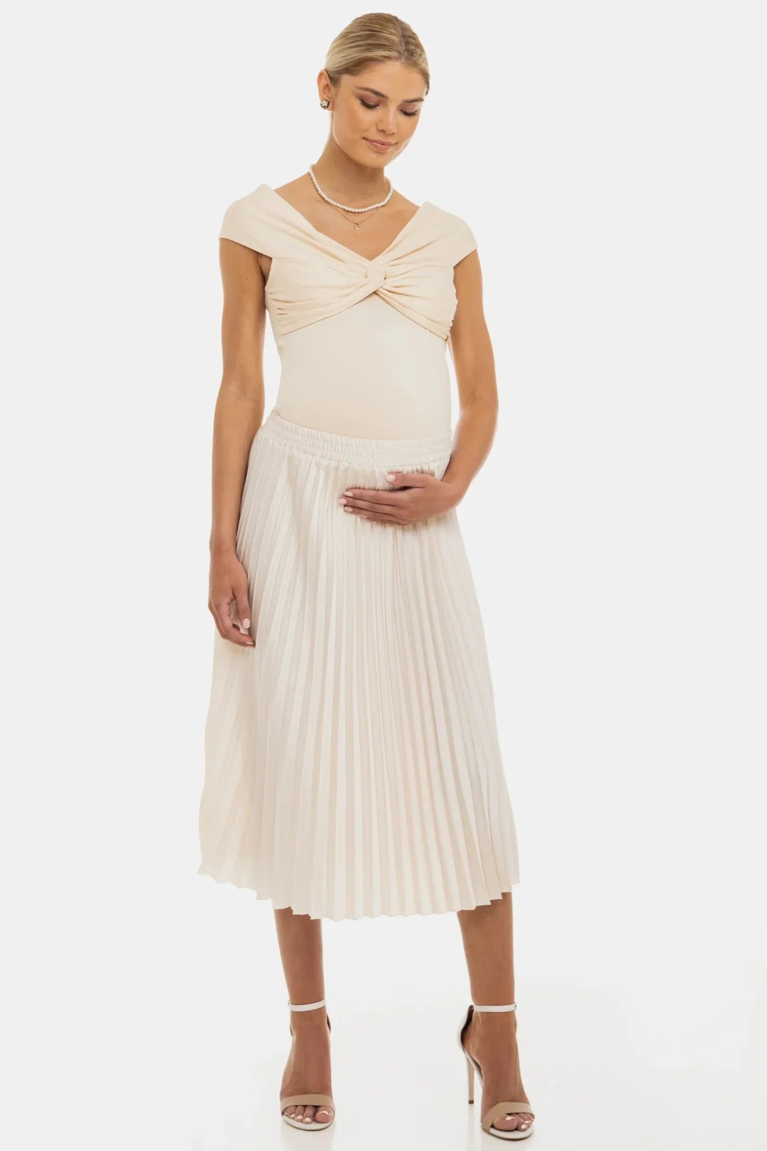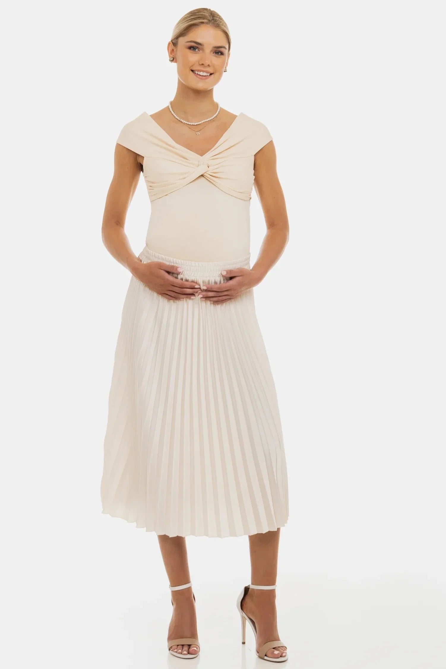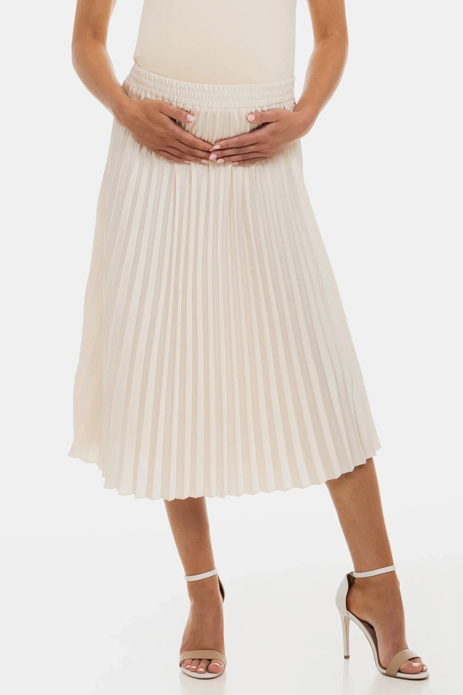 Lekka i zwiewna spódnica ciążowa w delikatnym odcieniu, która zamienia każdą chwilę w powód do lśnienia.