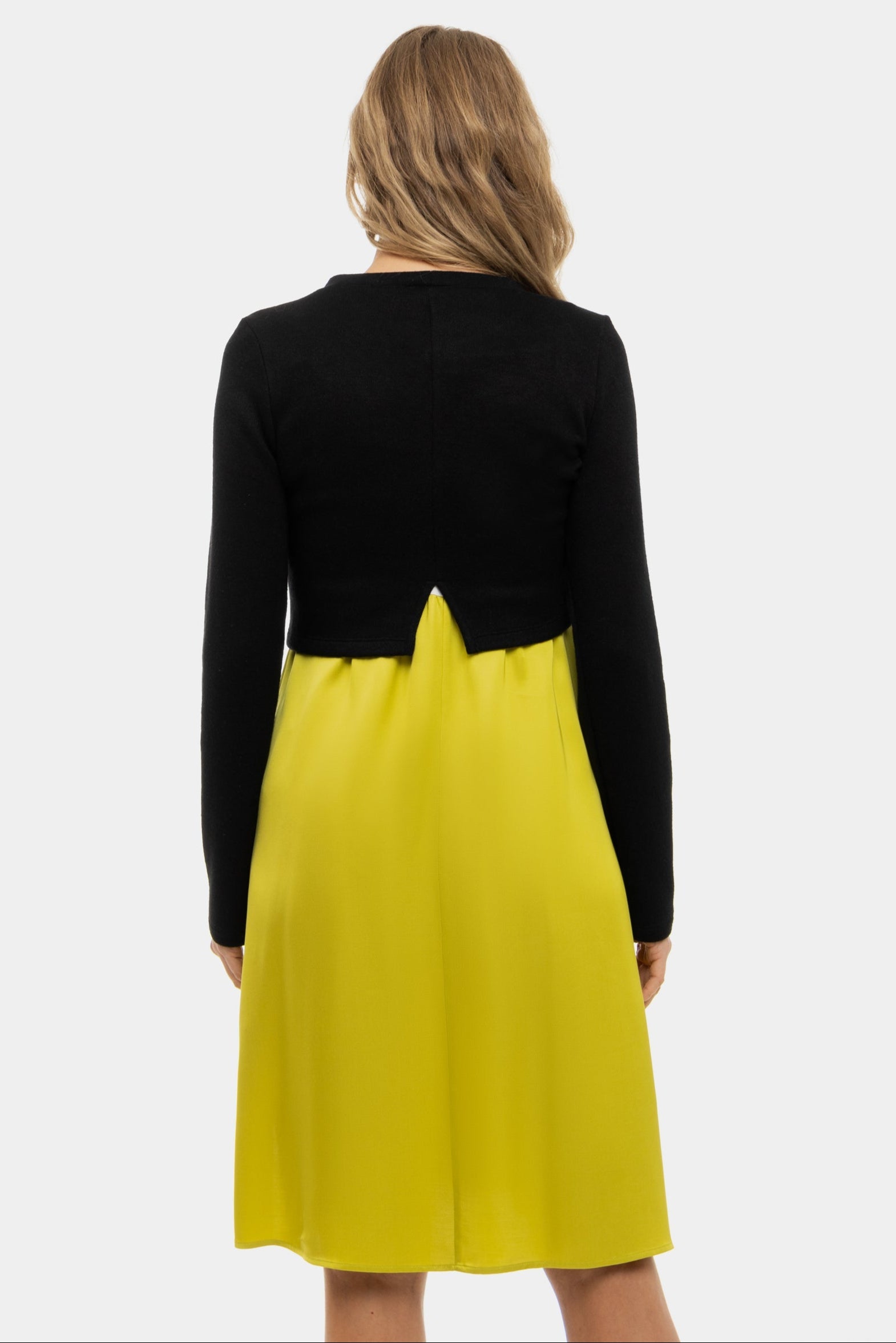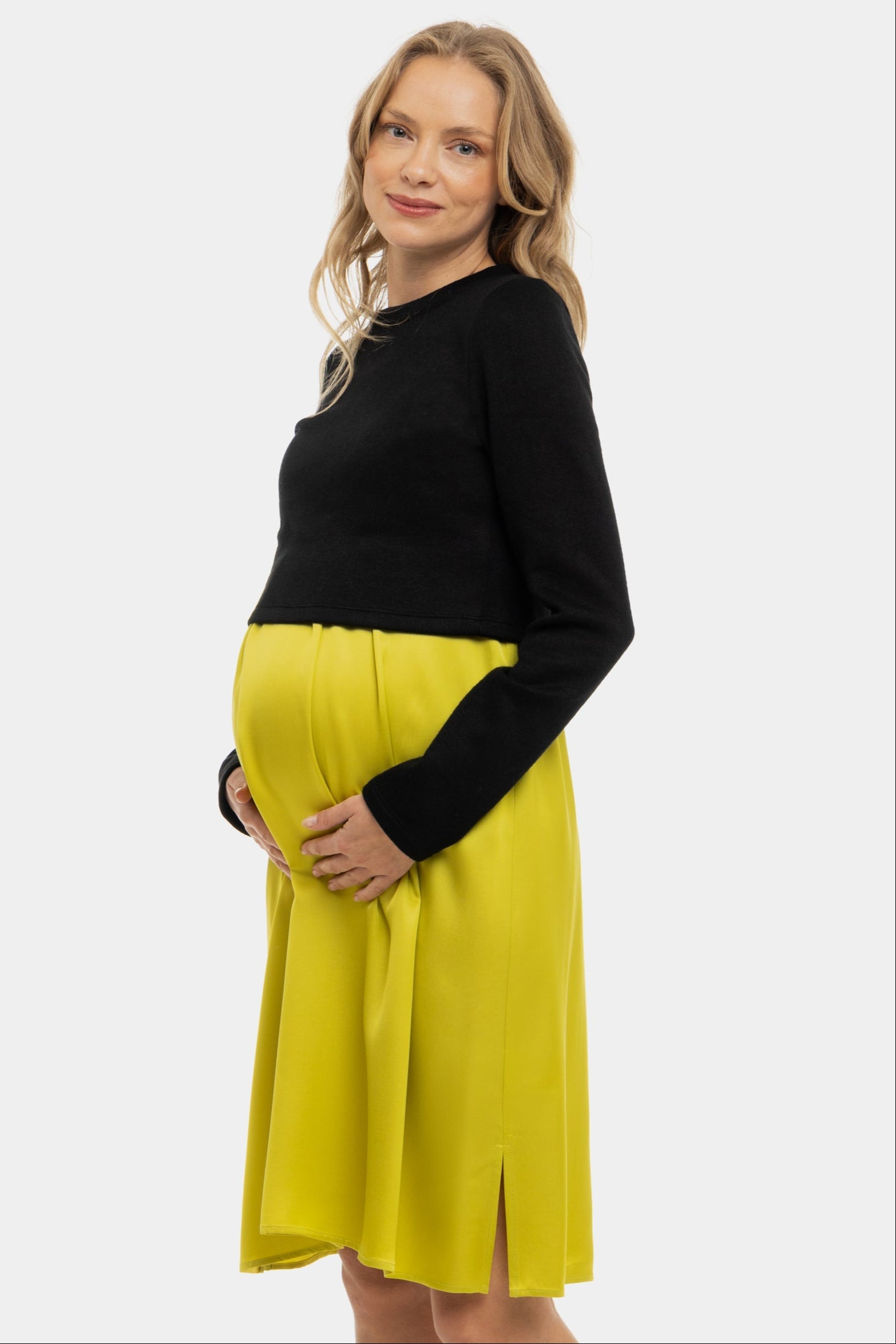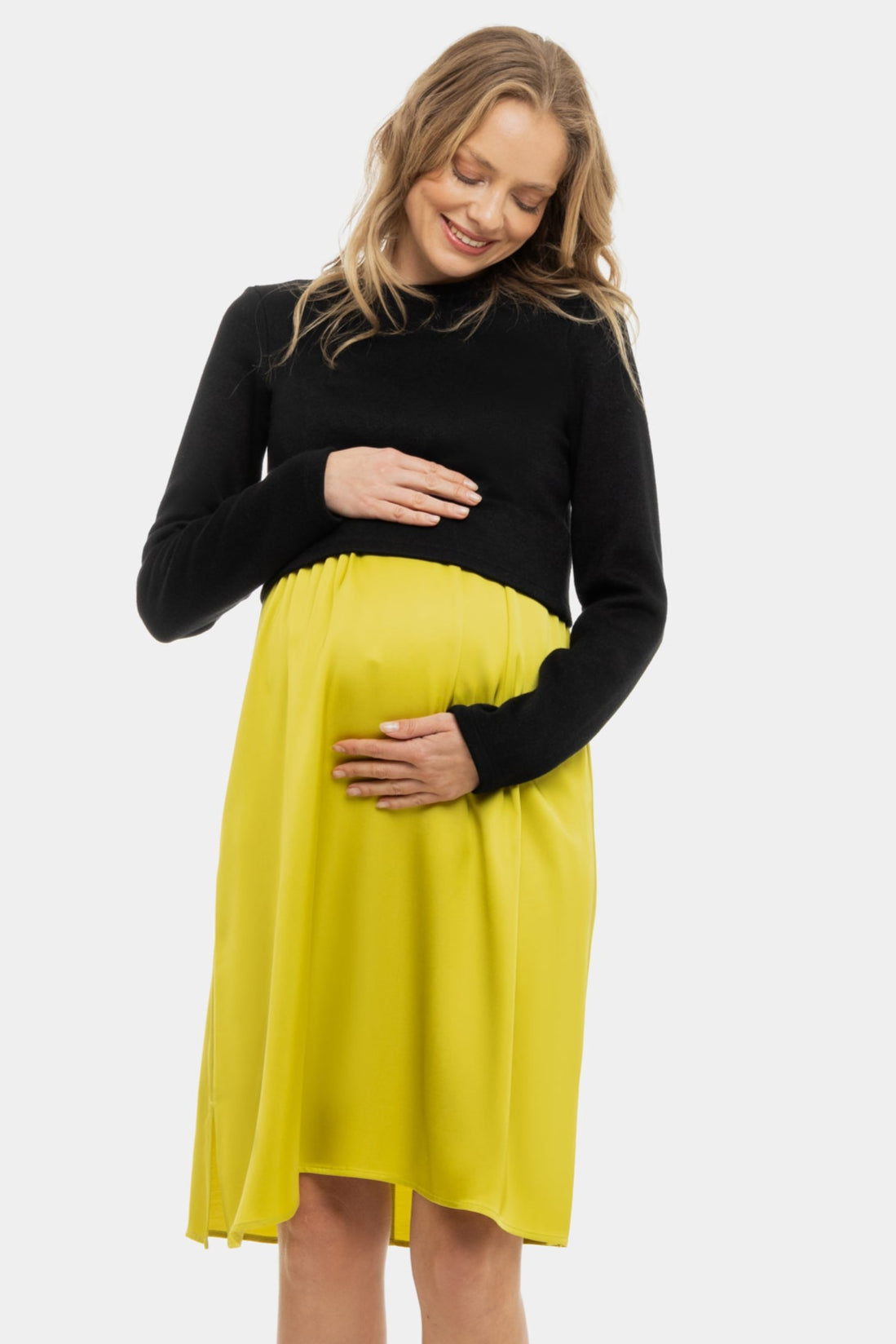 Satynowa sukienka z swetrem ciążowa i do karmienia – cytrynowa
