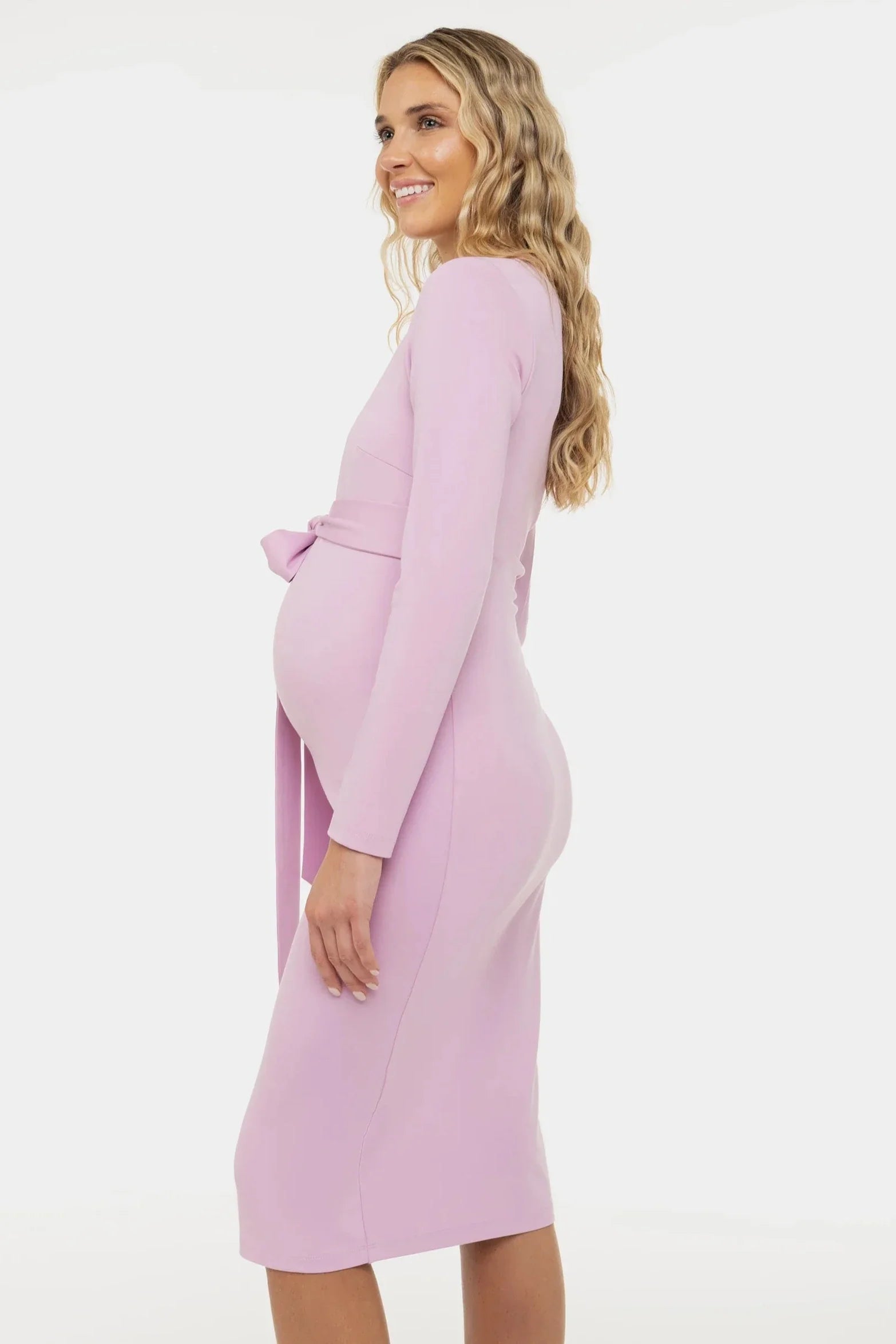 Elegancka długa sukienka ciążowa z szerokim paskiem w jasnofioletowym kolorze