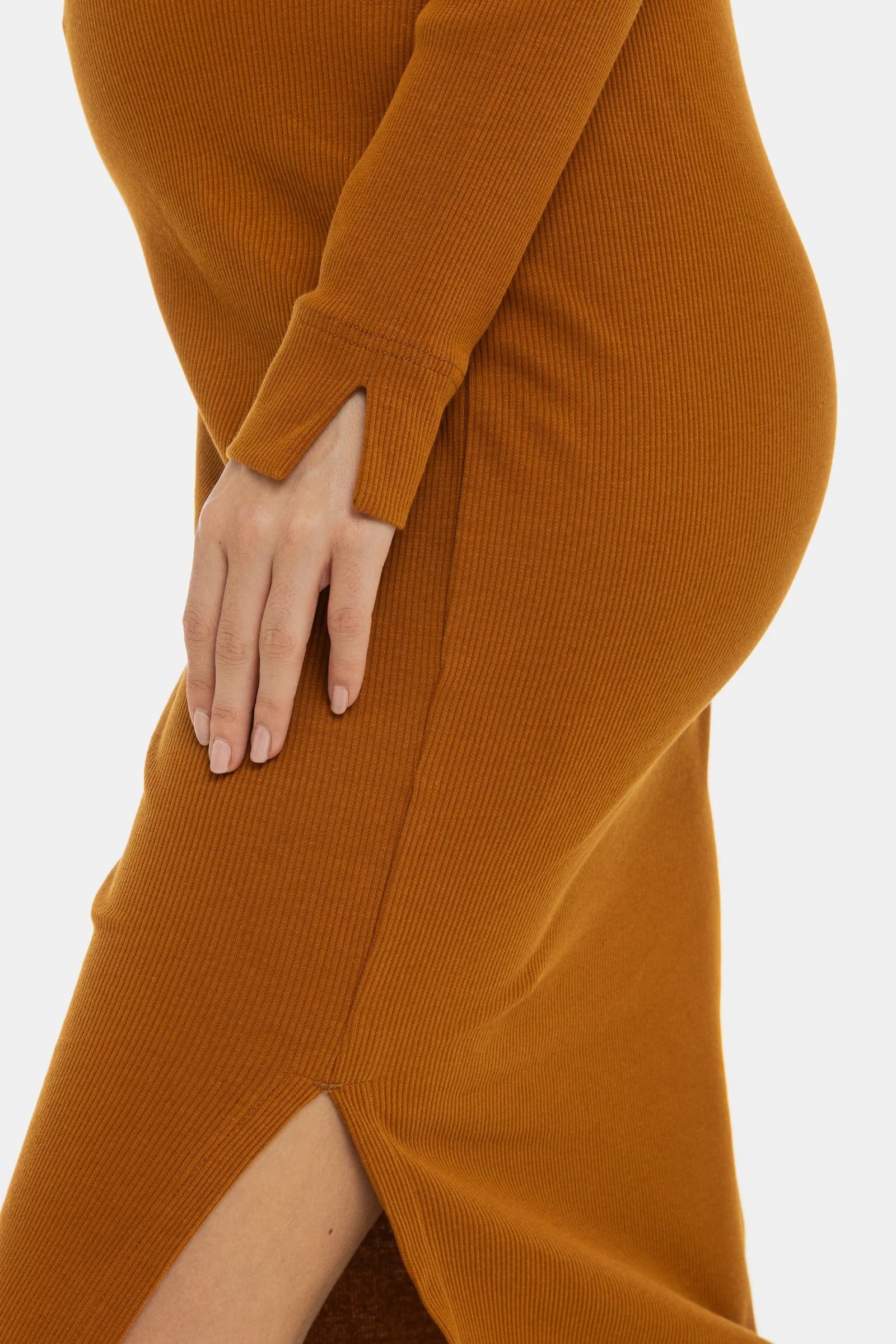 - Sukienka ciążowa z prążkowanej bawełnianej dzianiny w karmelowym kolorze