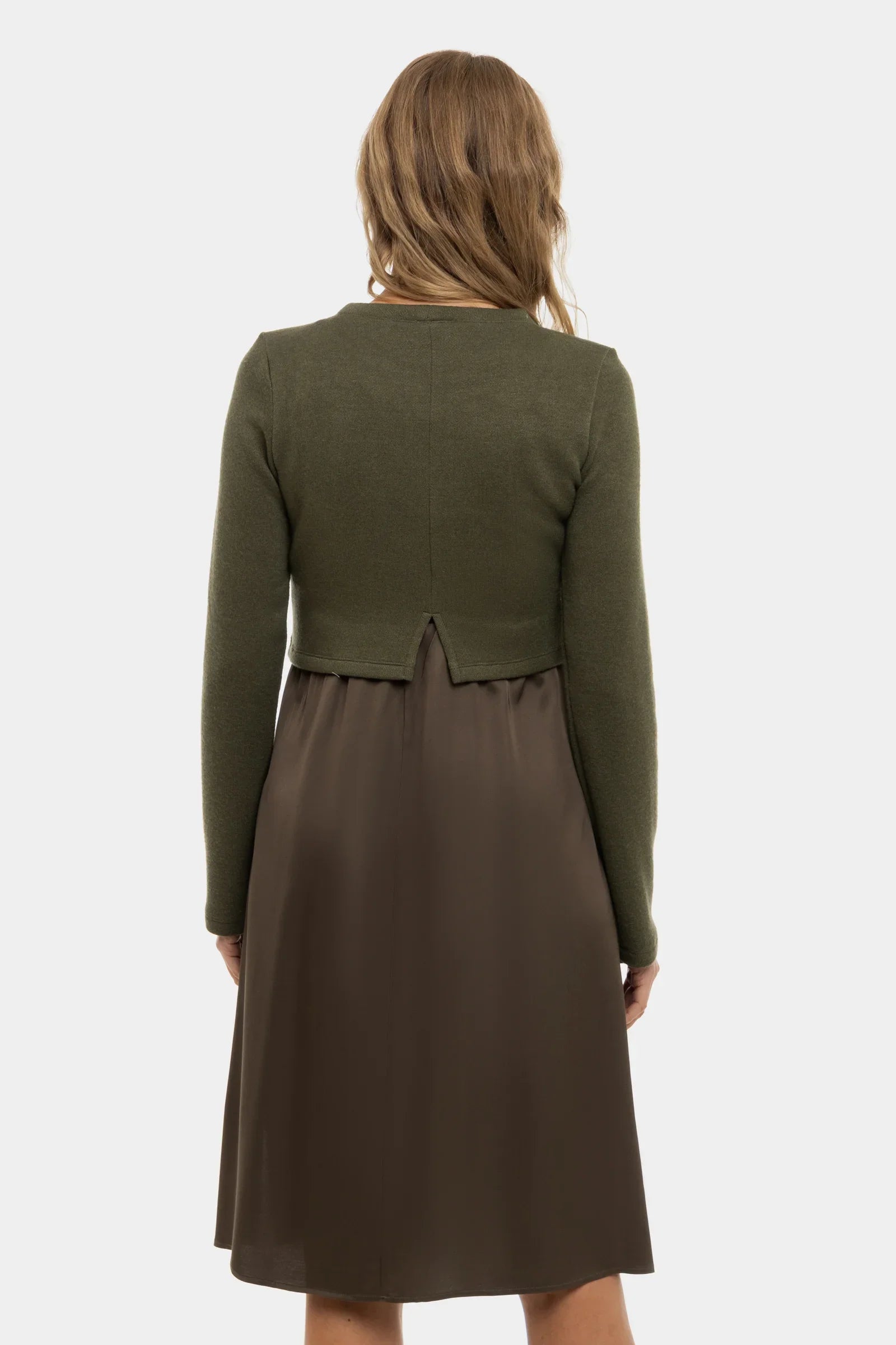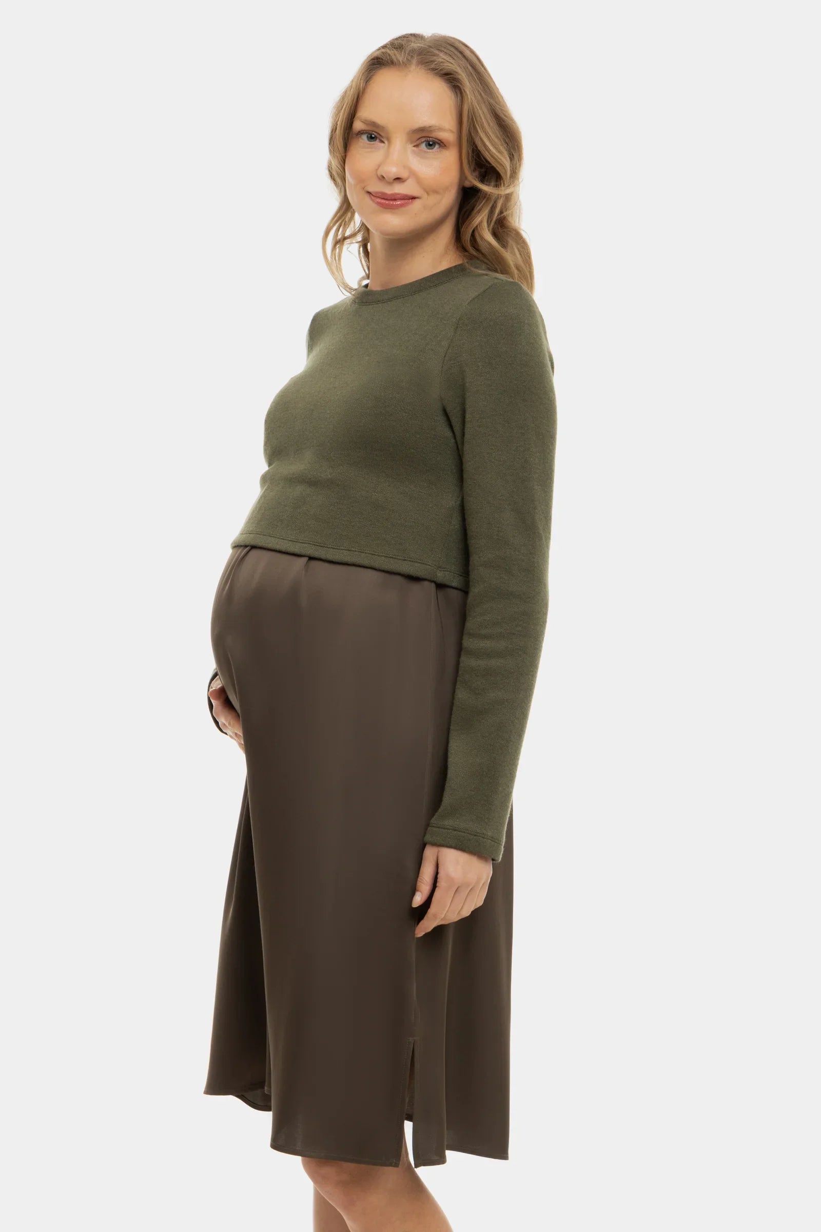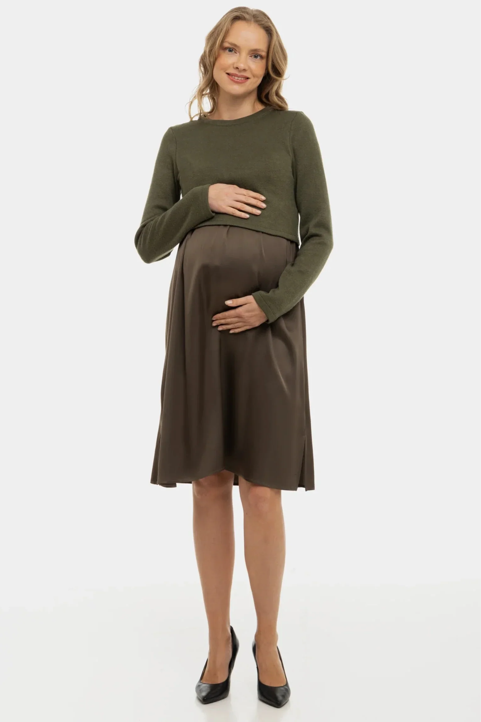 Satynowa sukienka z swetrem ciążowa i do karmienia – khaki