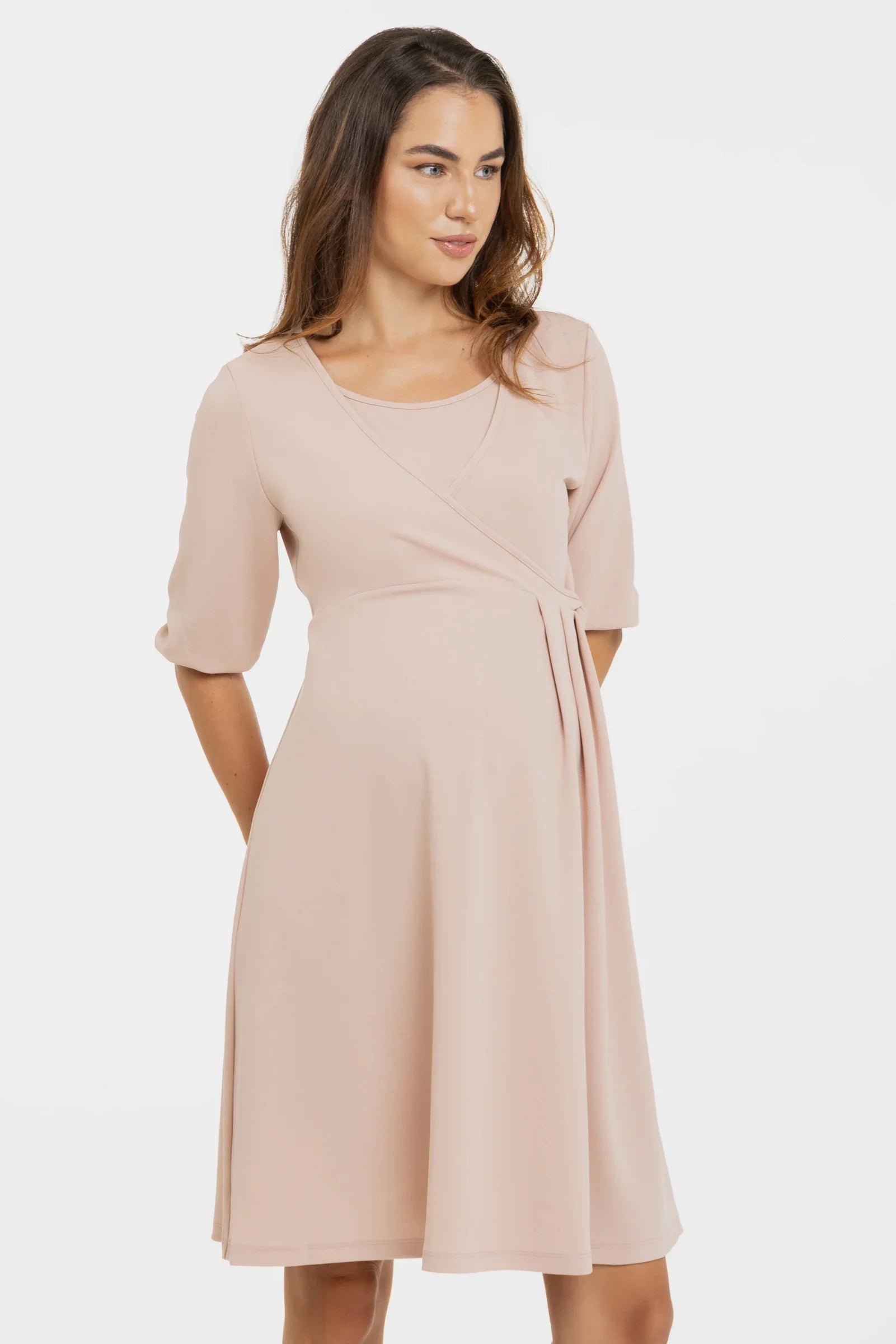 - Sukienka ciążowa wykonana z elastycznej tkaniny o delikatnej fakturze w pudrowym różu
