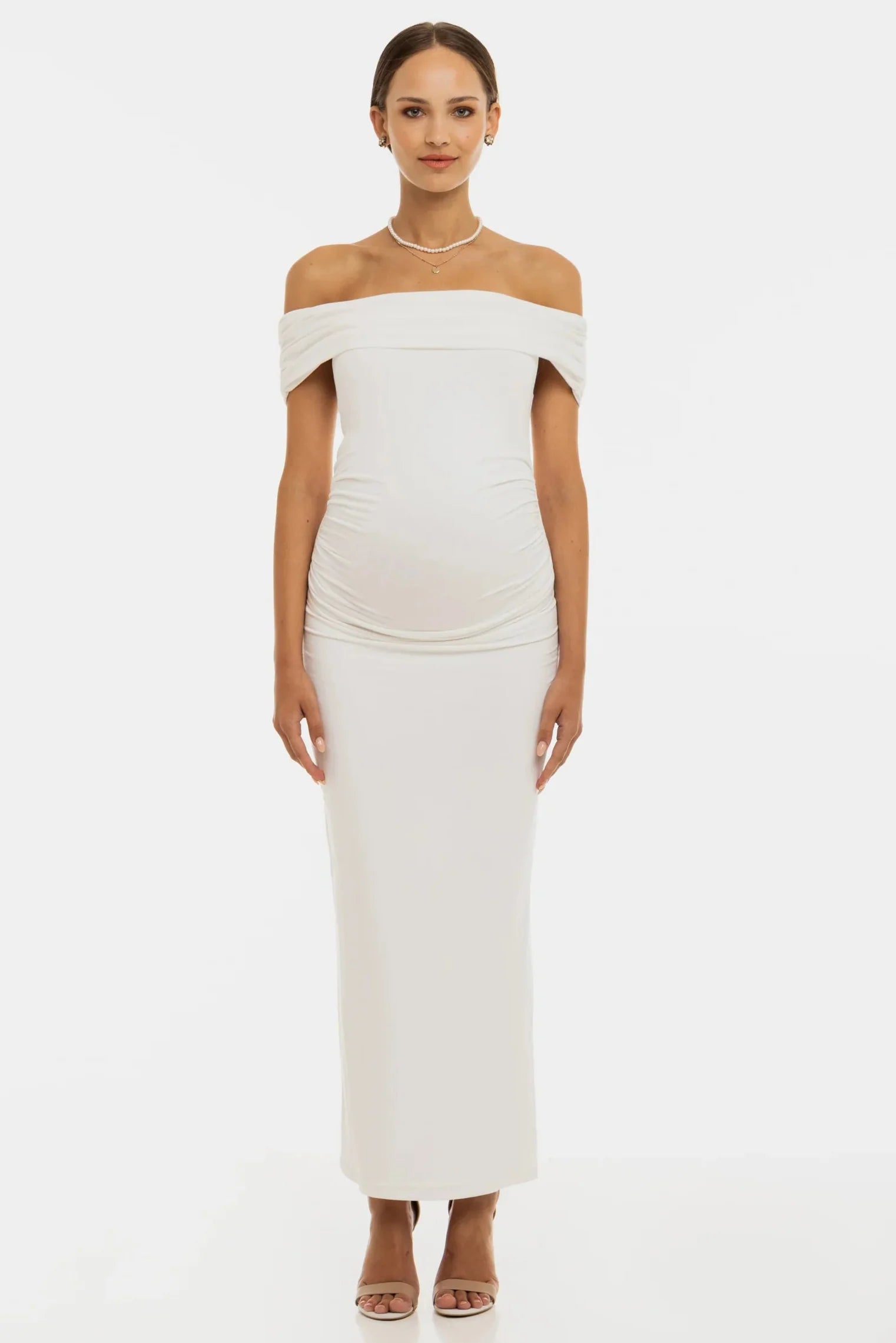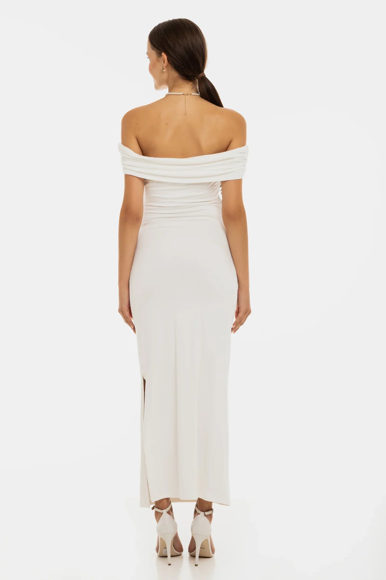 Długa suknia ślubna z marszczeniami – ecru