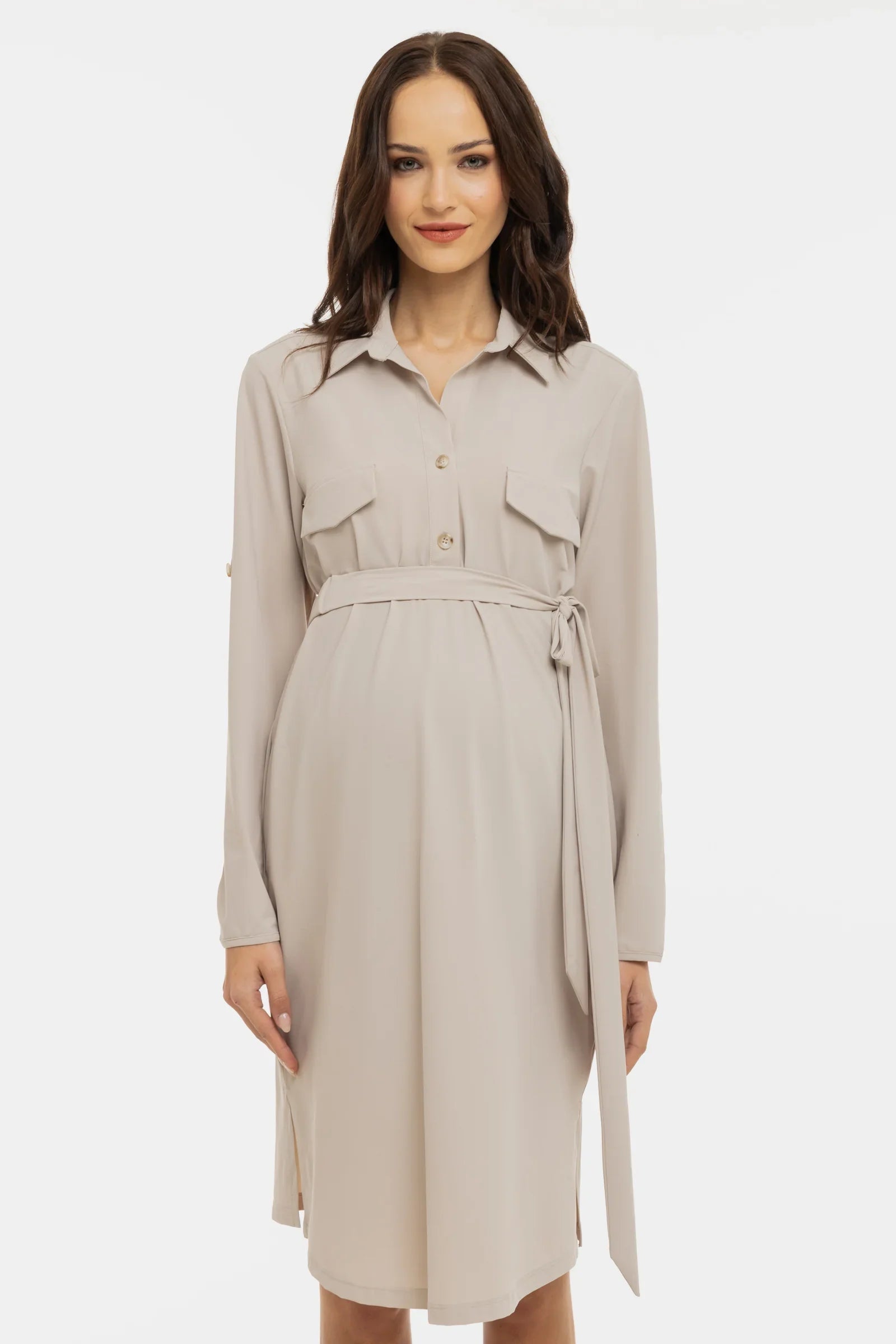 Еластична немачкаща се рокля-риза с удобен колан, който подчертава талията. Роклята може да се носи през цялата бременност и след това!