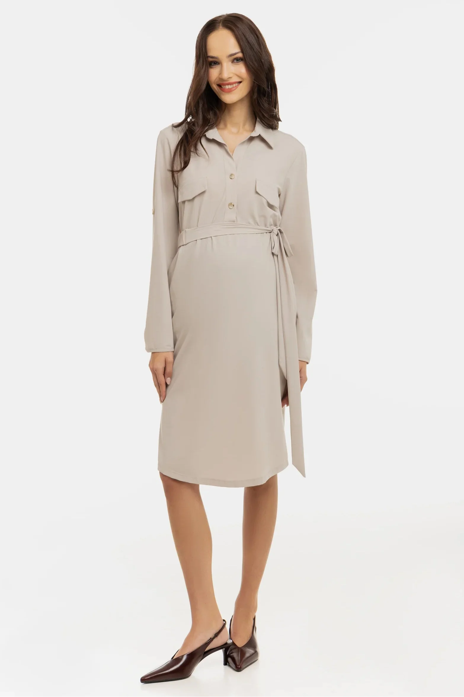 Еластична рокля с яка за бременни и кърмещи - бежова