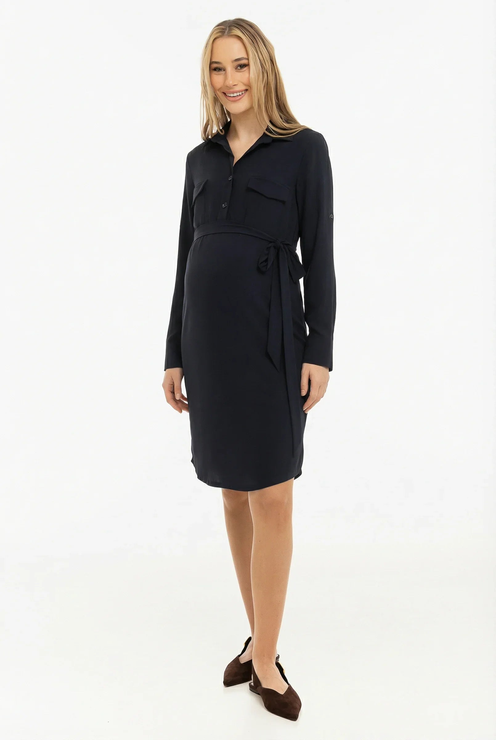 Еластична немачкаща се рокля-риза с удобен колан, който подчертава талията. Роклята може да се носи през цялата бременност и след това!
