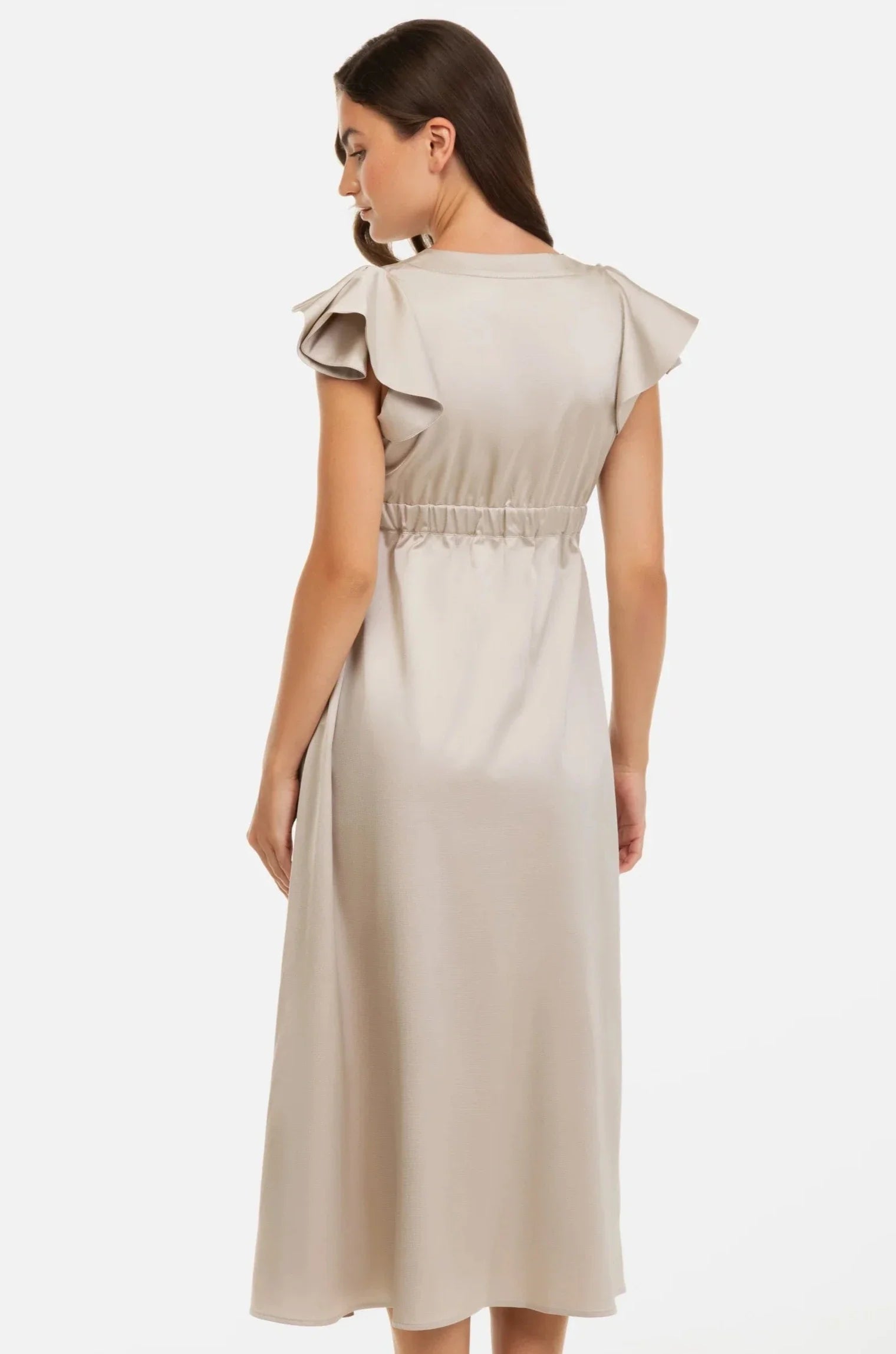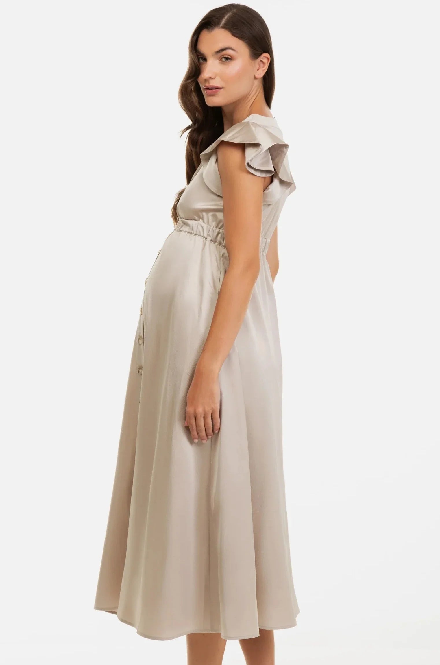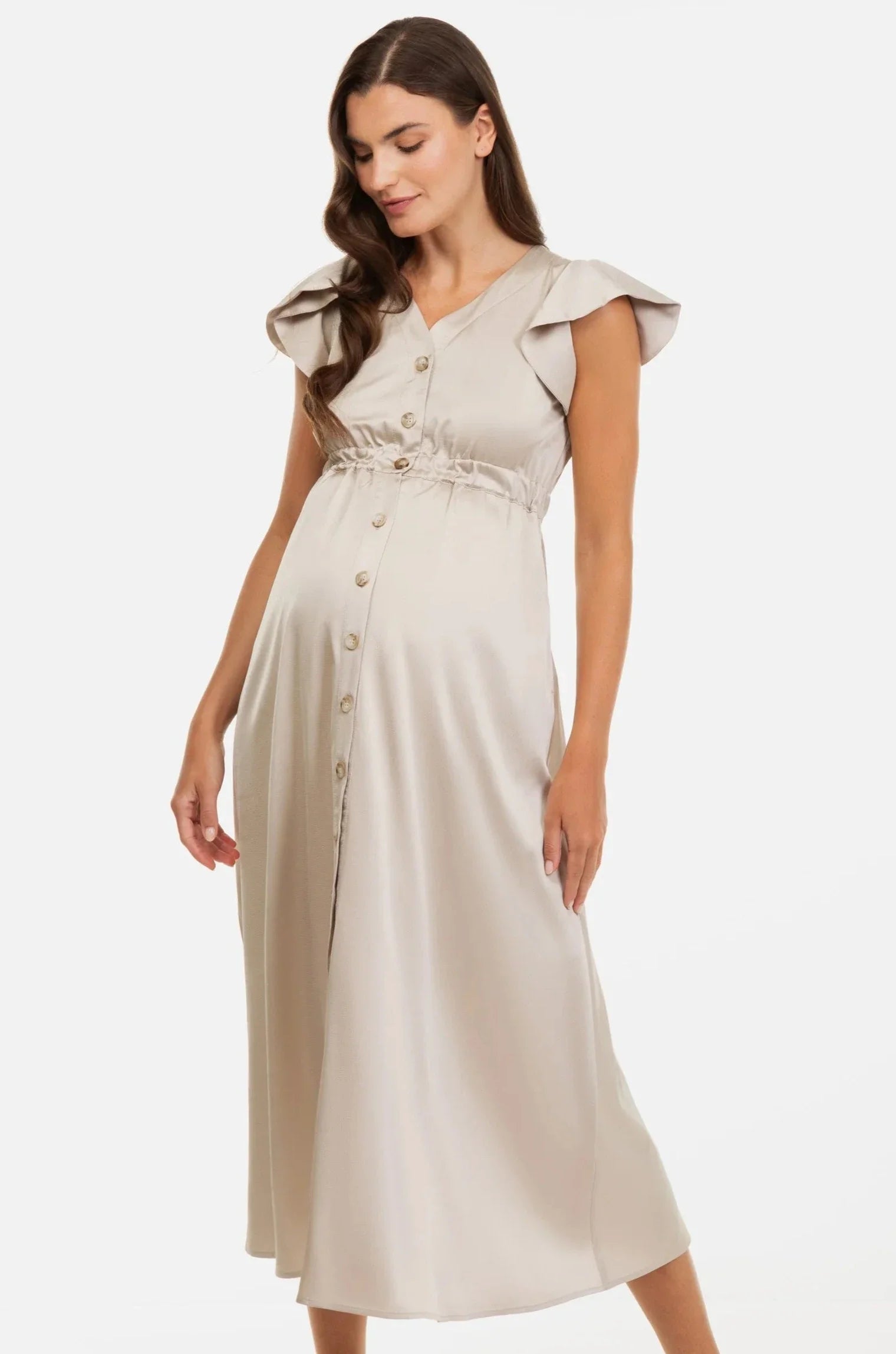 Beżowa satynowa sukienka ciążowa i do karmienia z falbanami