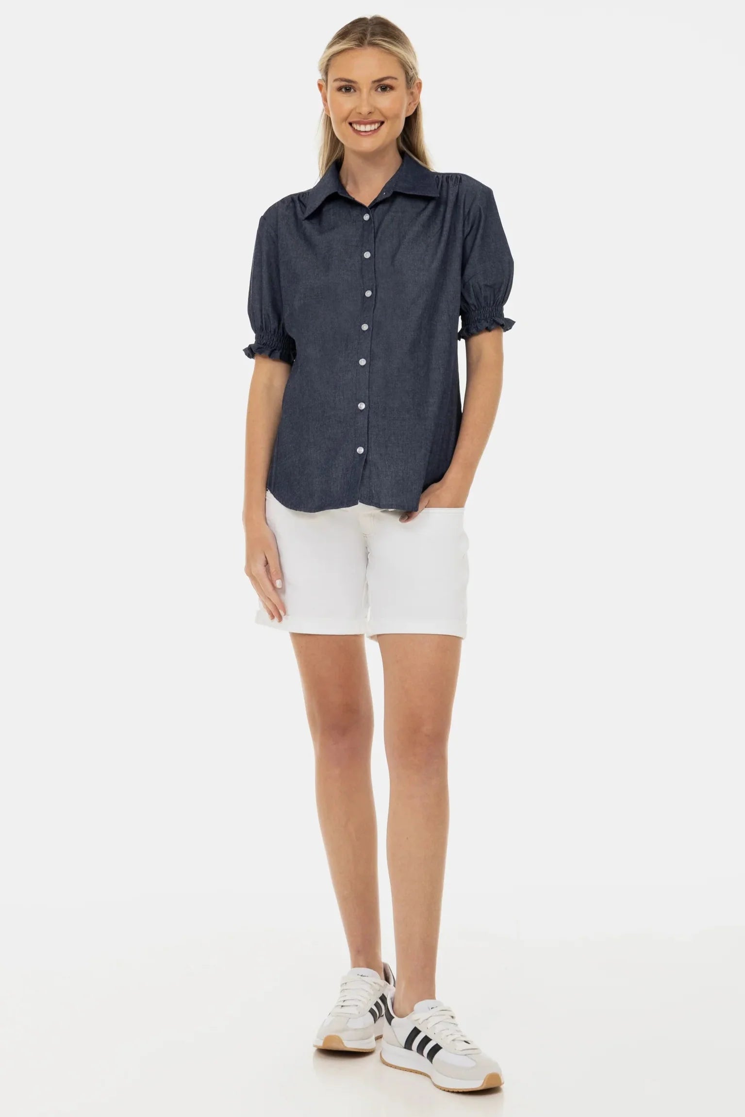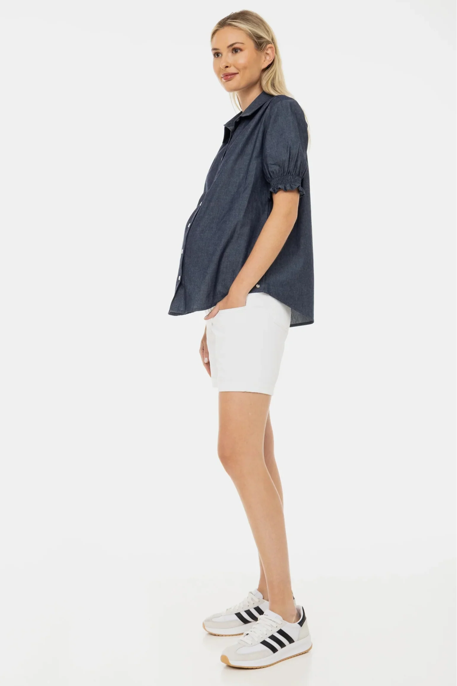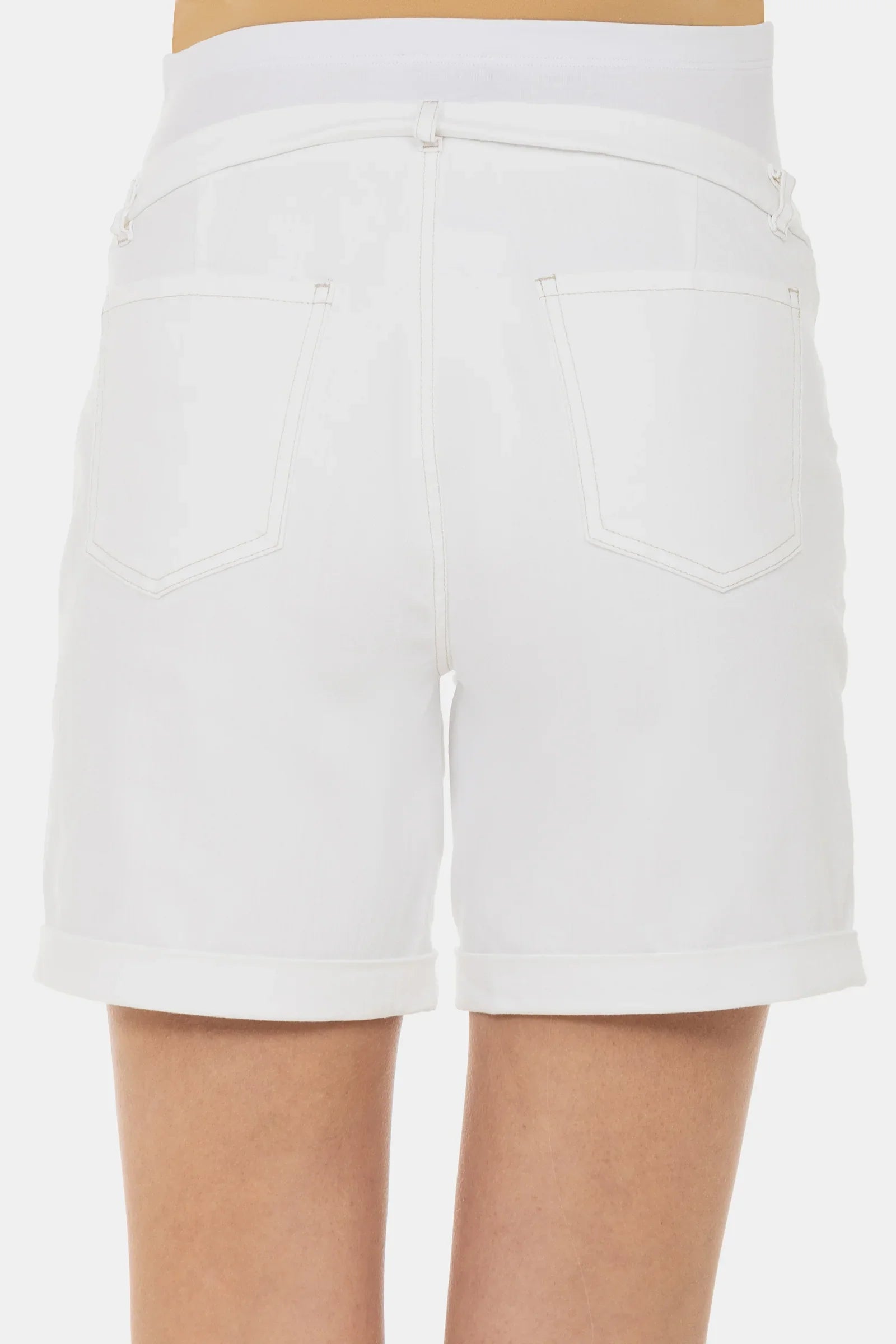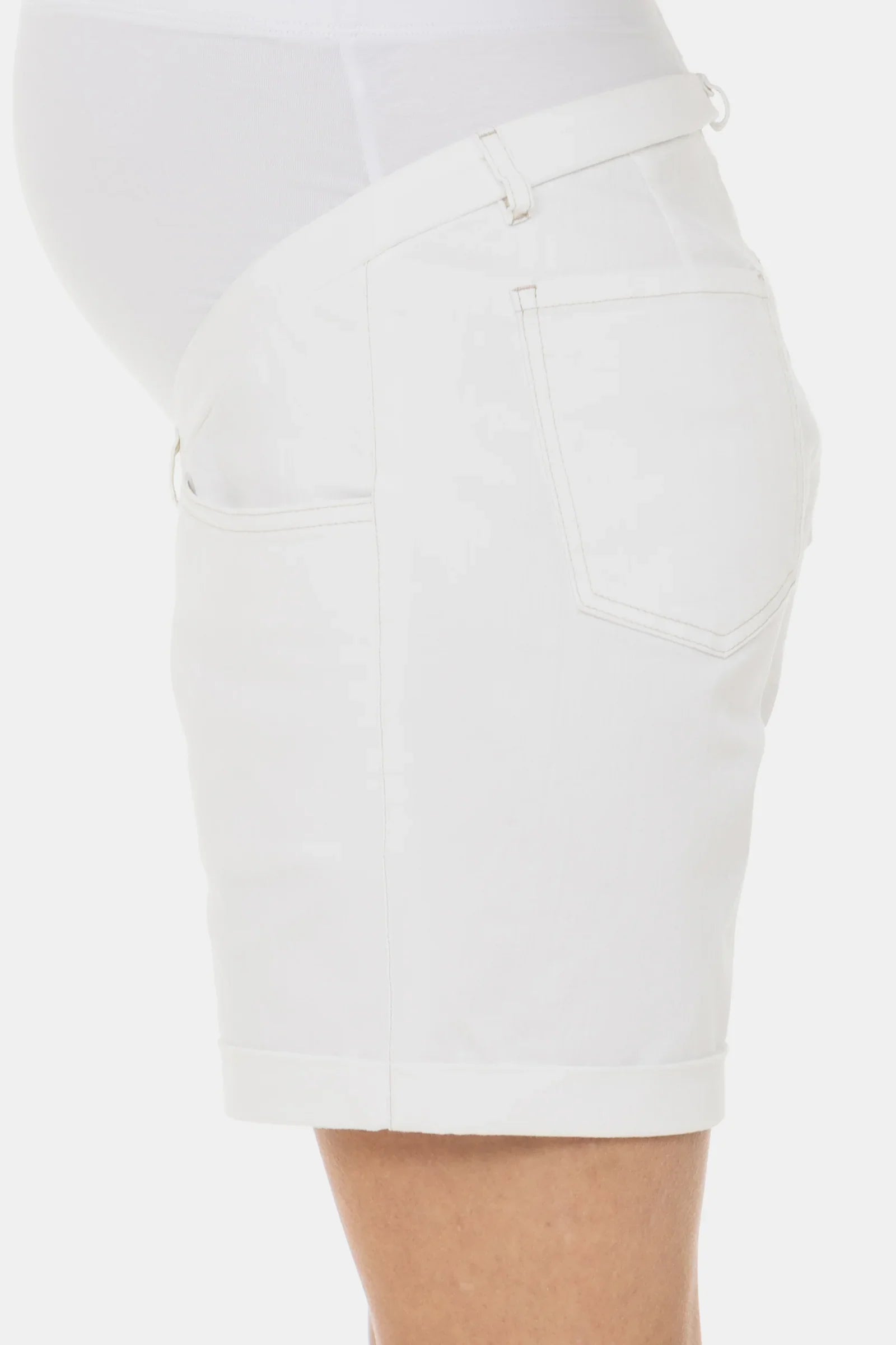 - Krótkie spodnie ciążowe z elastycznego jeansu w kolorze białym