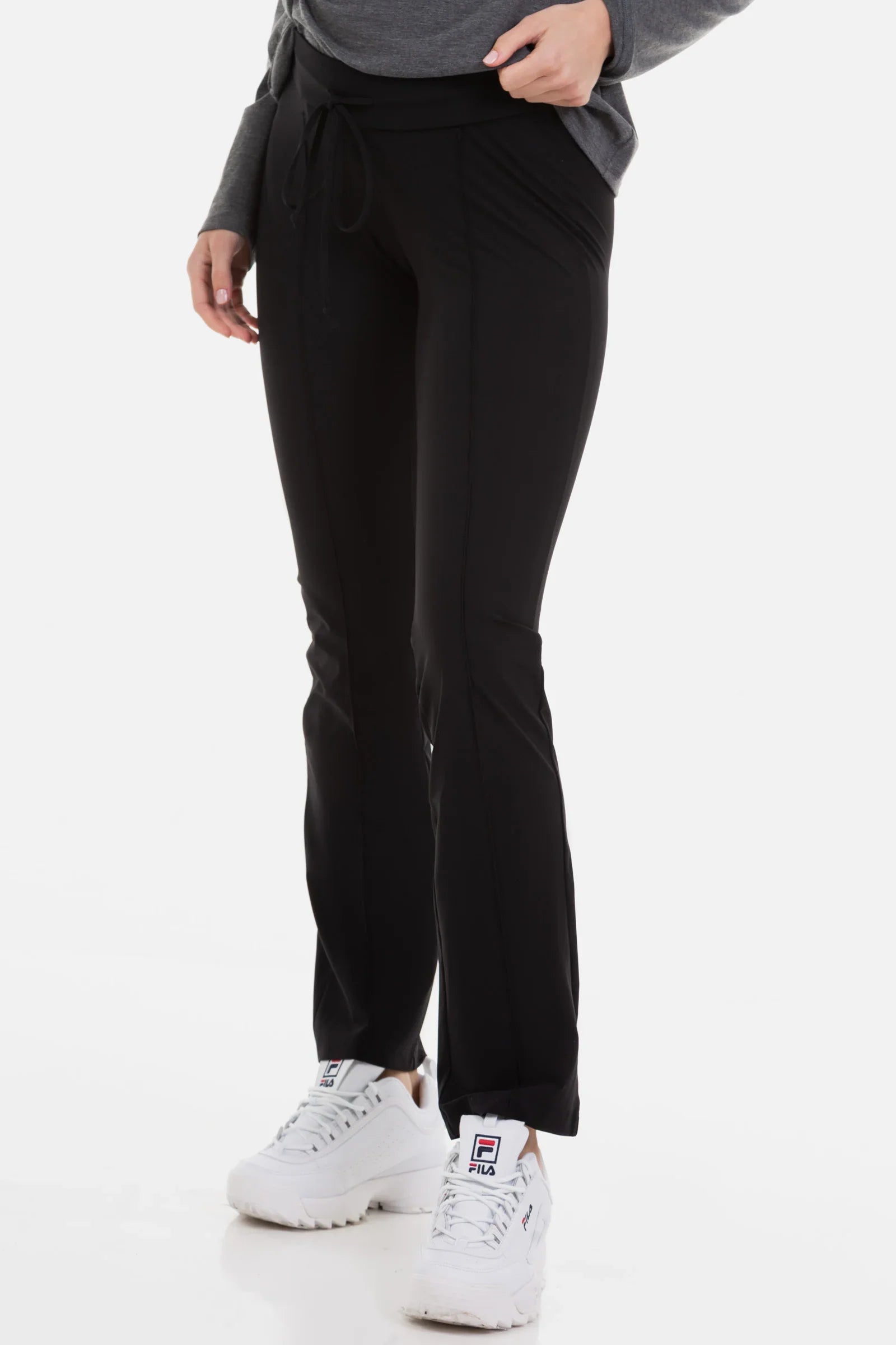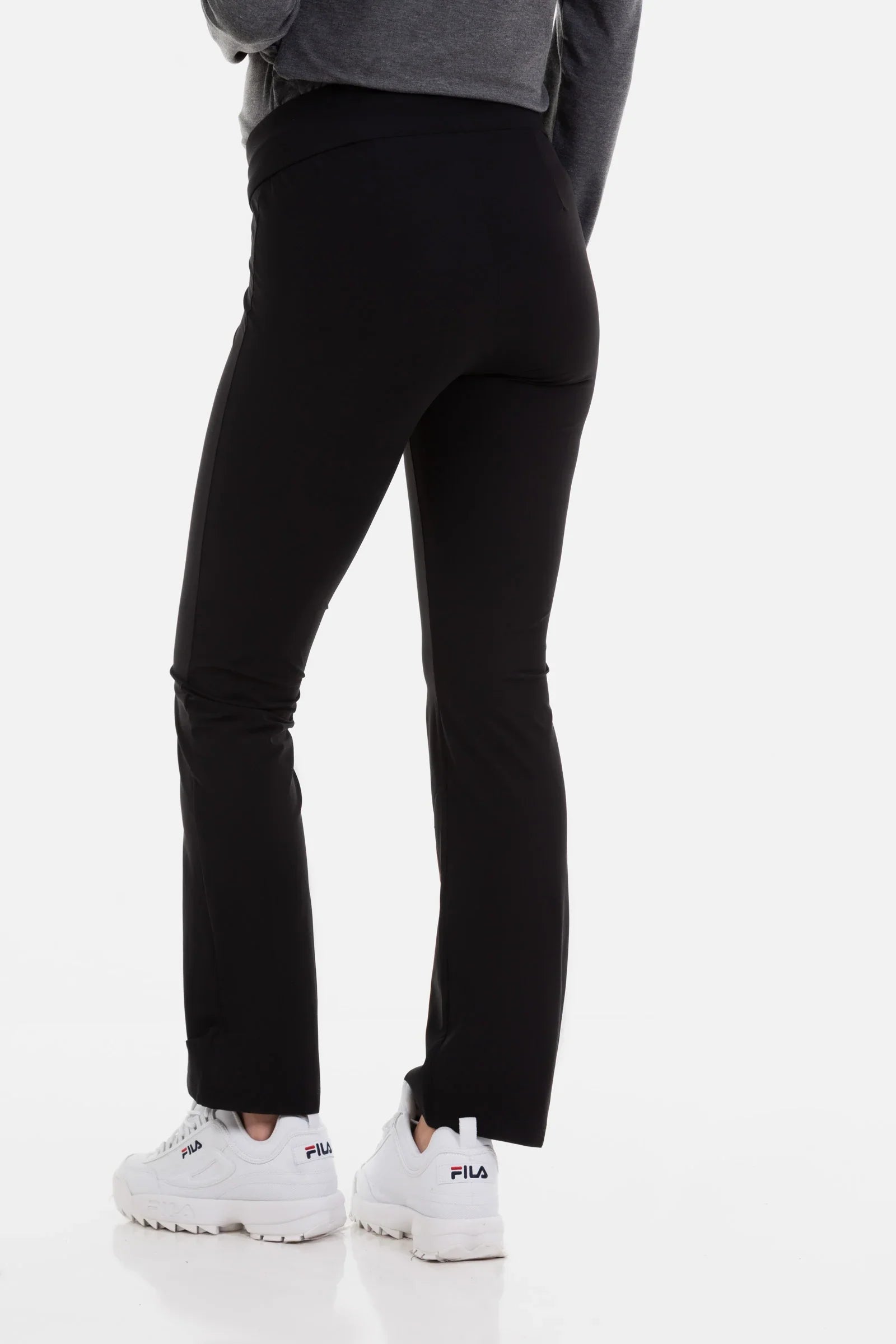 - Spodnie ciążowe wykonane z elastycznej tkaniny w czarnym kolorze