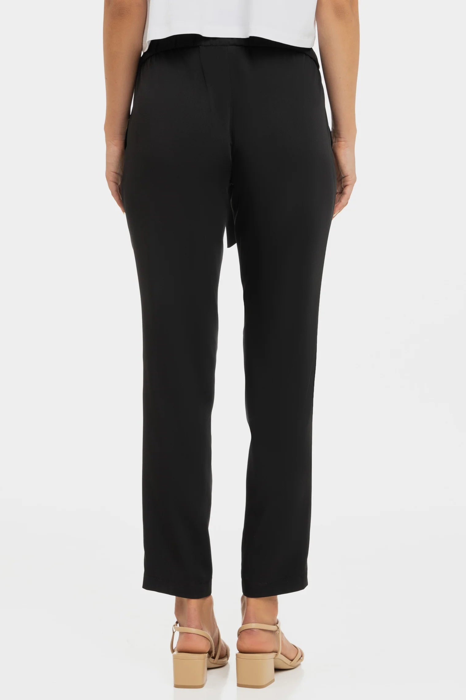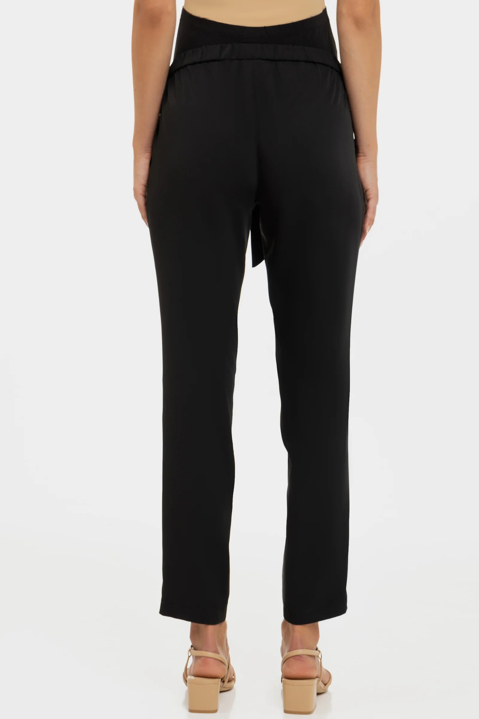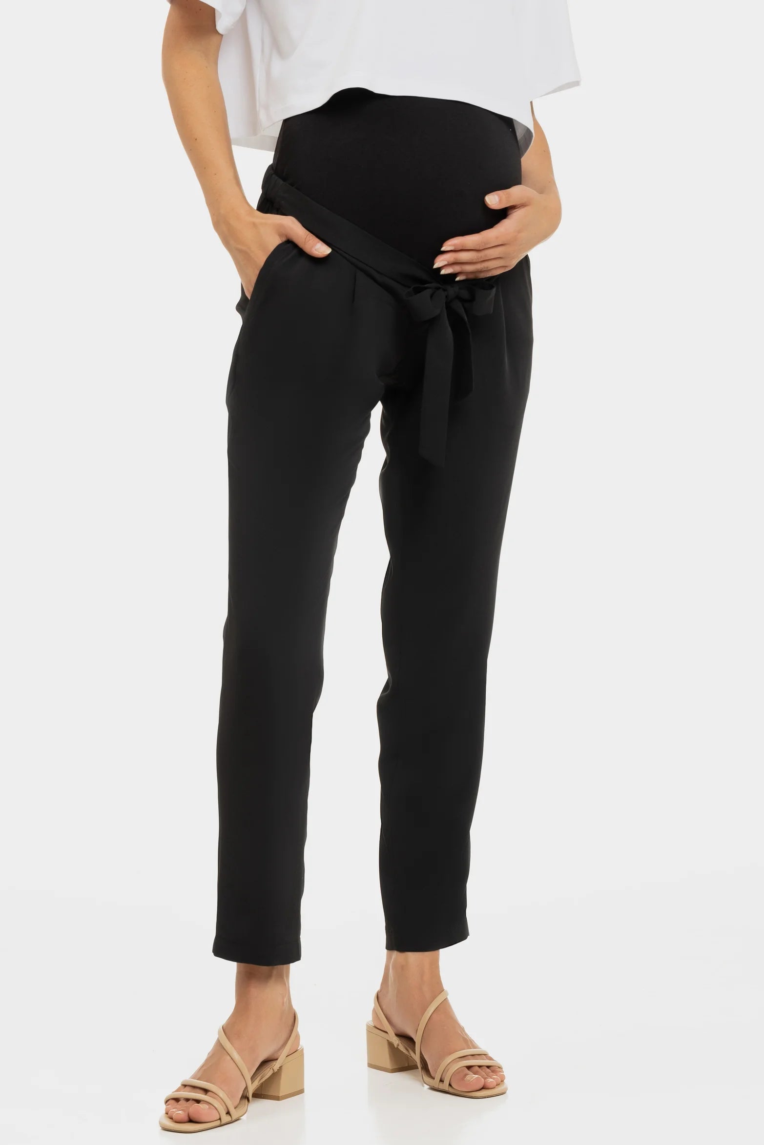 Eleganckie spodnie ciążowe z żorżetowej tkaniny, które optycznie wysmuklają sylwetkę.