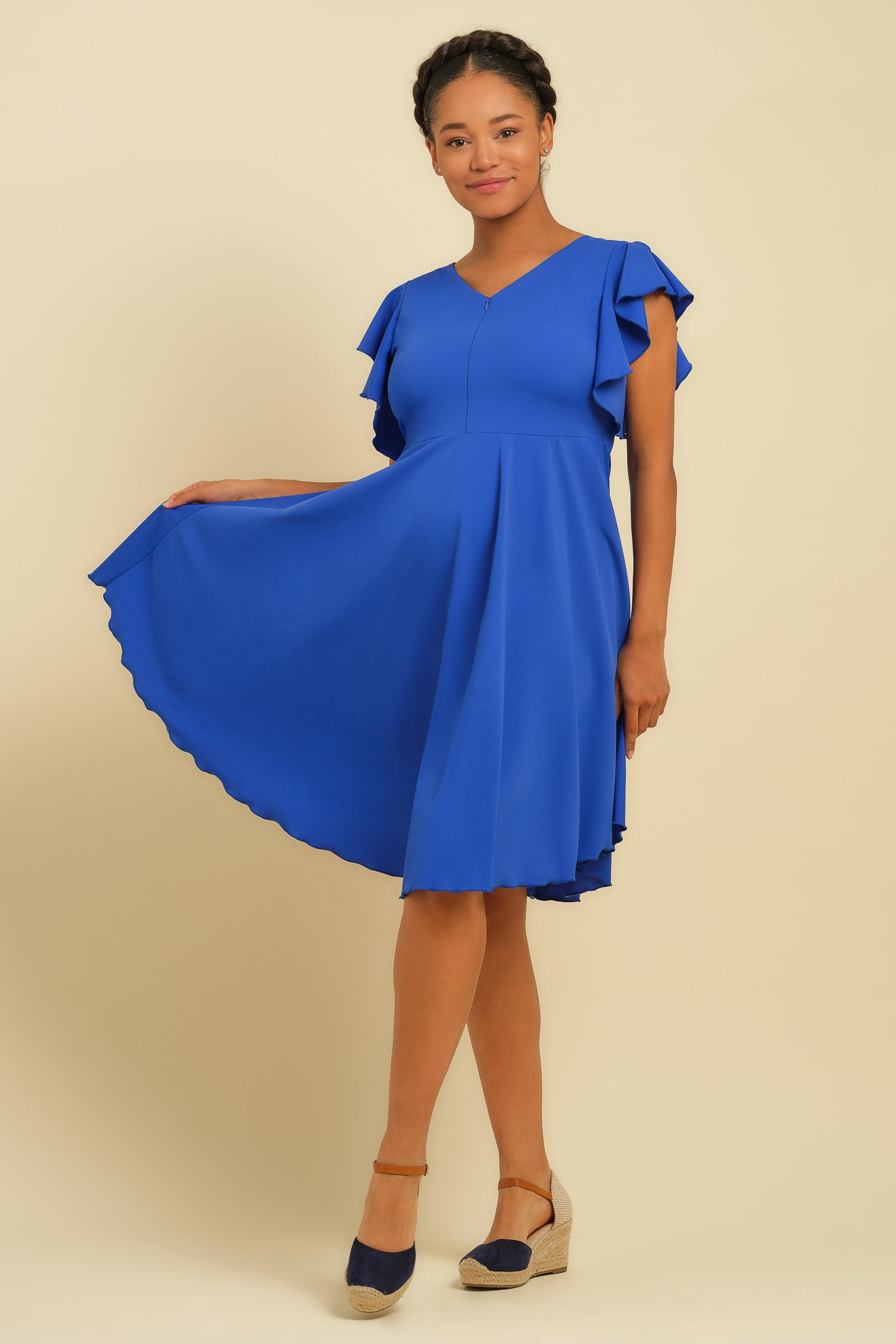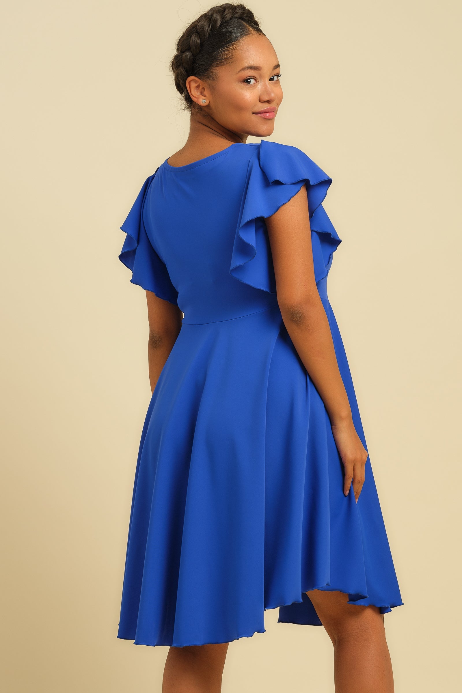 - Sukienka wykonana z elastycznego materiału w kolorze królewskiego błękitu